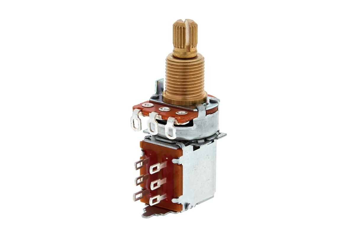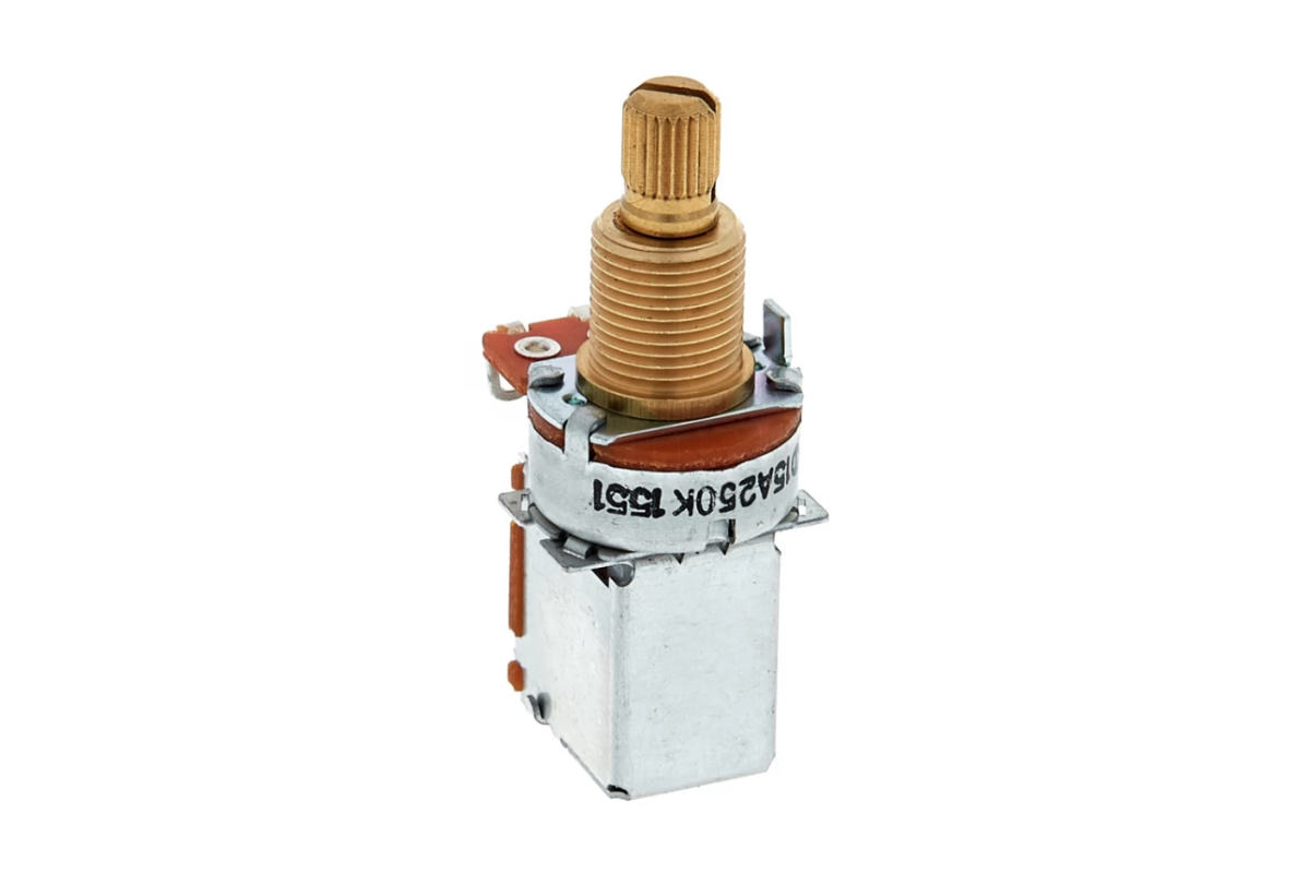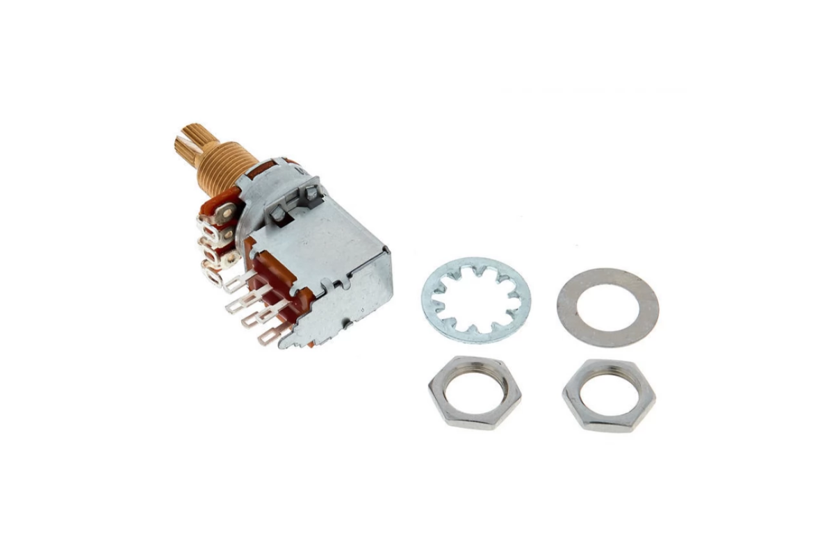 Пуш-пул потенциометр 250кОм, audio taper (логарифмический), для электрогитары, с крепежной гайкой.