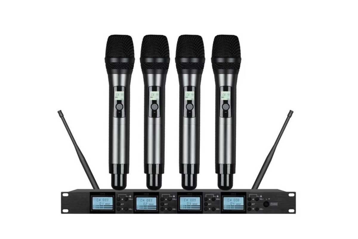 Беспроводная четырехканальная микрофонная система с ручными микрофонами.