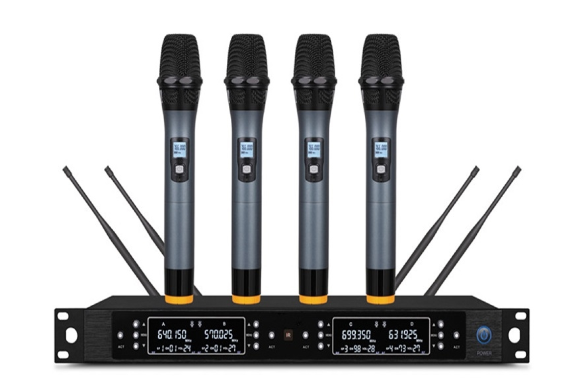 Беспроводная четырехканальная микрофонная система с ручными микрофонами.