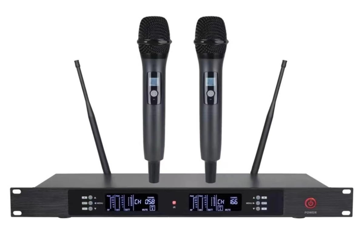Беспроводная двухканальная микрофонная система с ручными микрофонами.