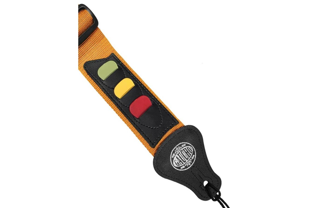 Сделанный из прочного нейлона яркого желтого цвета, гарантирует надежную поддержку гитары и длительный срок службы. Главное преимущество — три встроенных кармана для медиаторов, которые обеспечивают их доступность прямо во время игры.