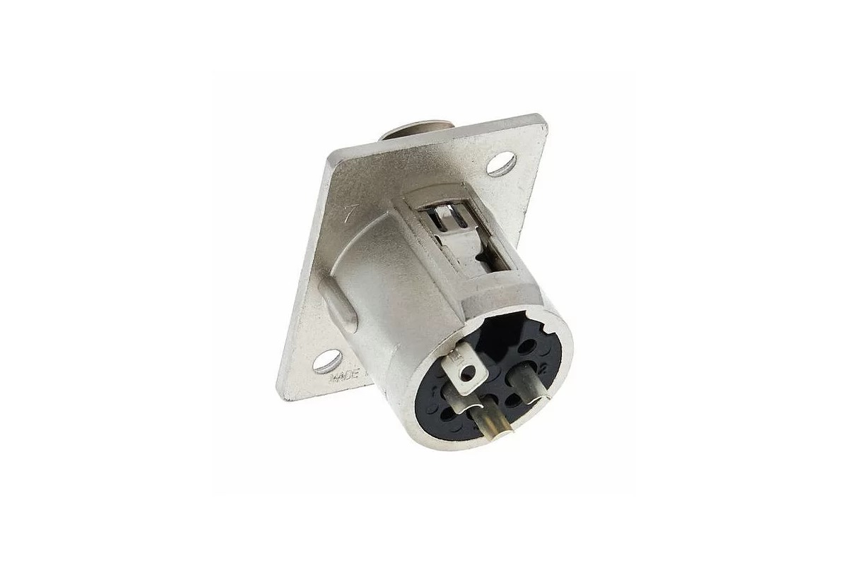 Панельный разъем XLR, 3-х контактный <гнездо/мама>, P-серия, фланец P-типа, компактный металлический никелированный корпус, контакты – серебро покрытия, под пайку.