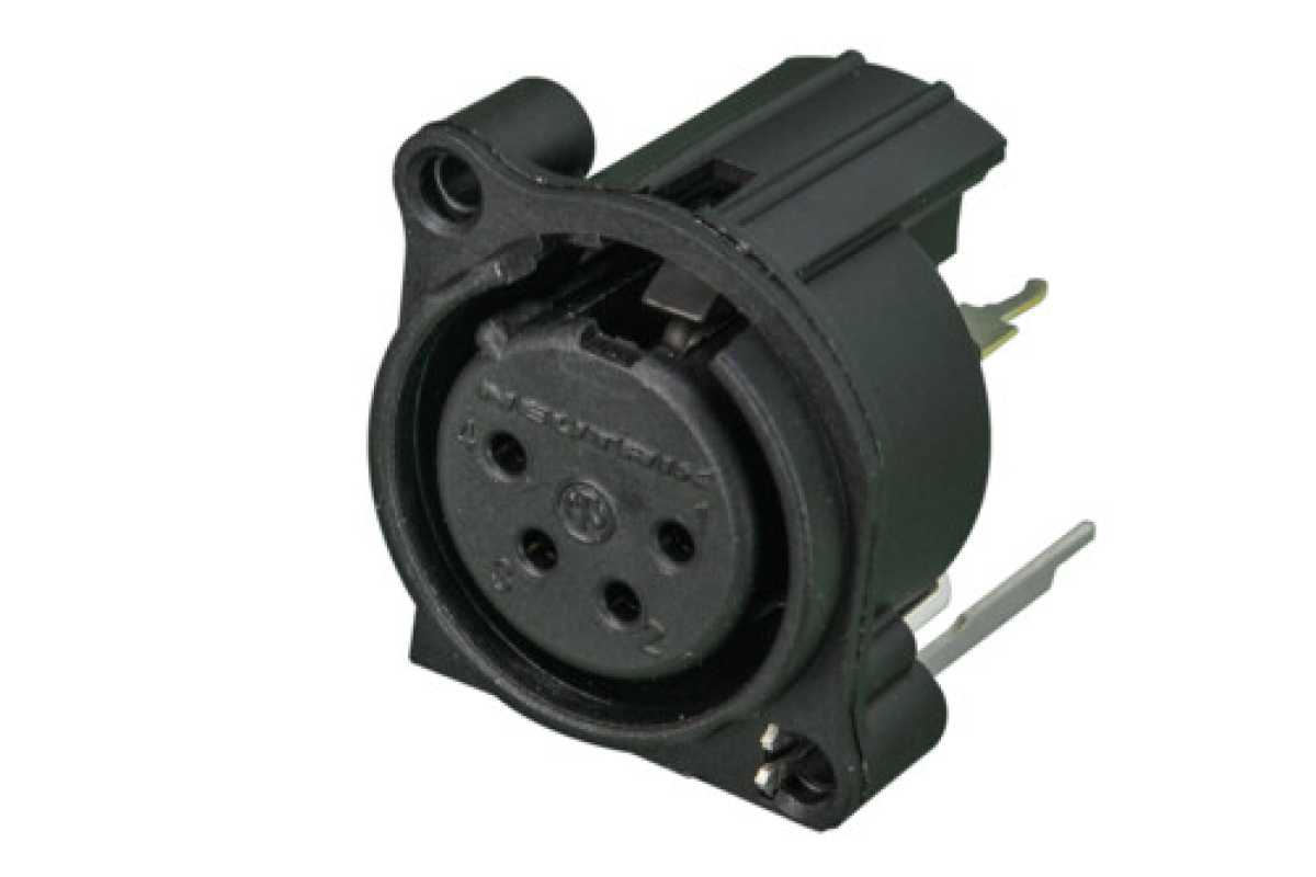 4-контактный разъем XLR типа "мама" с заземлением: отдельный контакт заземления для соединения с корпусом разъема и передней панелью, вертикальное крепление на печатную плату, пружина, удерживающая вместо защелки, возможна цветная маркировка.