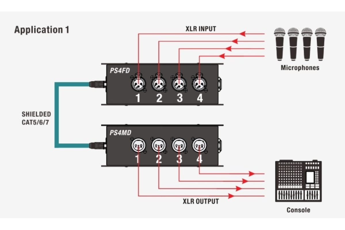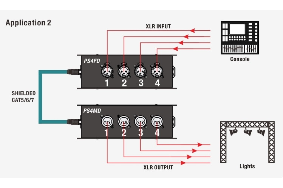 Используется для подключения одного экранированного кабеля CAT5,5E,6,6A или 7 для передачи и приема нескольких консолей, микрофонов, музыкальных инструментов, динамиков и других аудиосигналов для компактного удобства передачи цифровых многоканальных сигналов или аналоговых симметричных сигналов.
