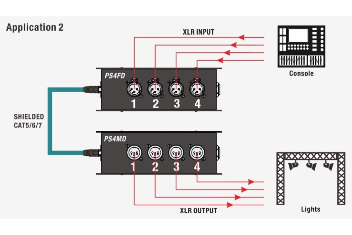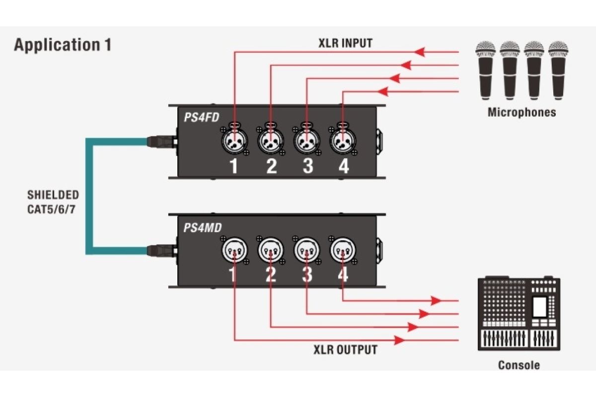 Используется для подключения одного экранированного кабеля CAT5,5E,6,6A или 7 для передачи и приема нескольких консолей, микрофонов, музыкальных инструментов, динамиков и других аудиосигналов для компактного удобства передачи цифровых многоканальных сигналов или аналоговых симметричных сигналов.