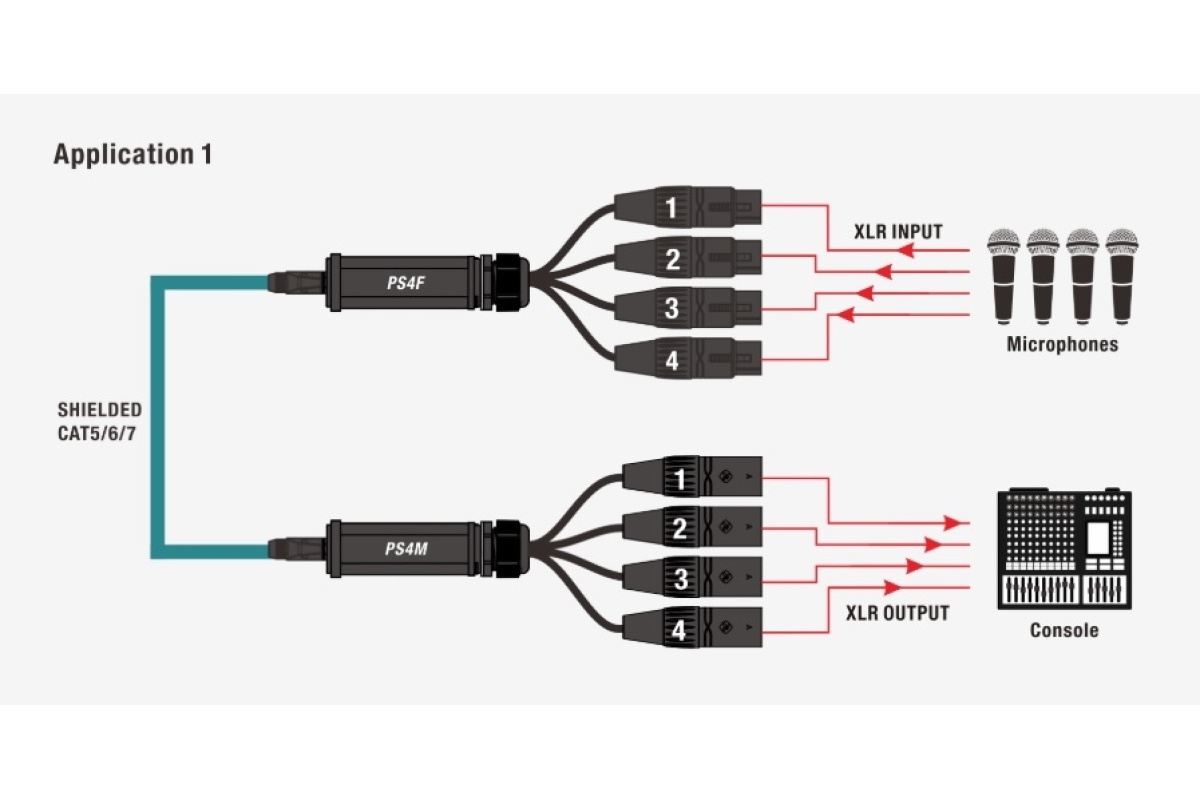 Используется для подключения одного экранированного кабеля CAT5,5E,6,6A или 7 для передачи и приема нескольких консолей, микрофонов, музыкальных инструментов, динамиков и других аудиосигналов для компактного удобства передачи цифровых многоканальных сигналов или аналоговых симметричных сигналов.