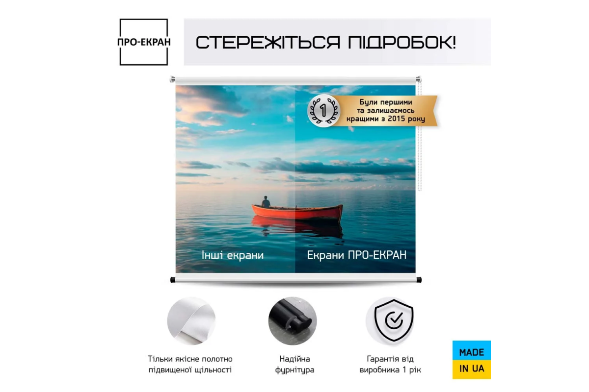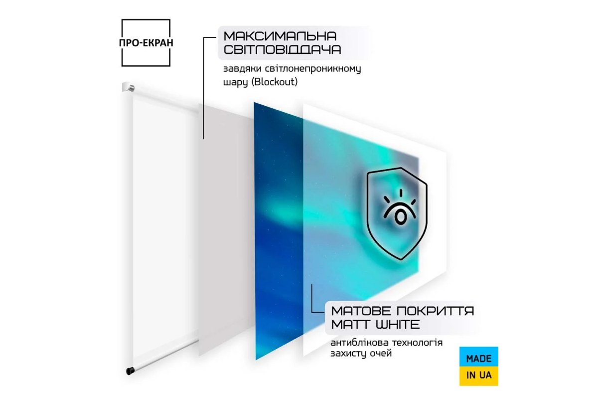 Для изготовления экранов ПРО-экран используется высококачественное белое полотно ПВХ с коэффициентом усиления 1 и натуральной цветопередачей. Матовая поверхность экрана гарантирует отсутствие бликов, обеспечивает высокую яркость и большие углы обзора до 170°.