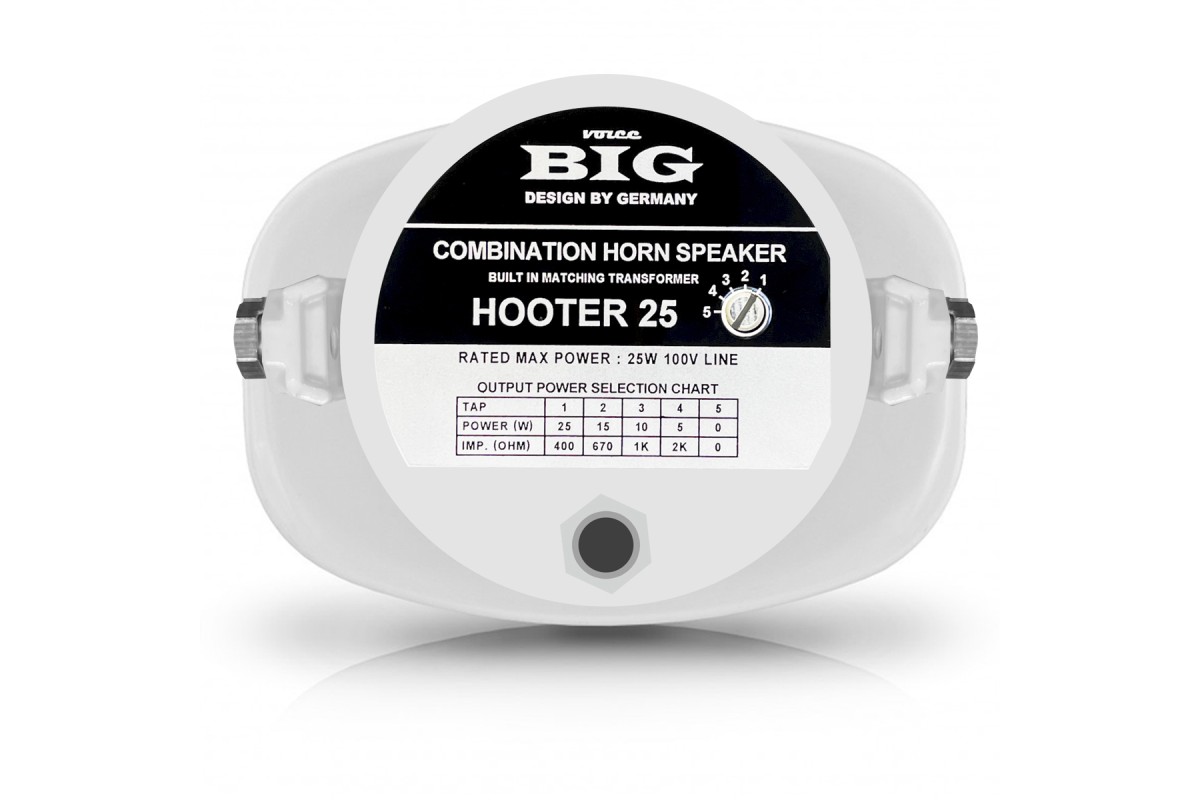 BIG HOOTER25W — це всепогодний рупорний гучномовець, призначений для трансляційного сповіщення, оповіщення і публічних оголошень. Він забезпечує чіткий та гучний звук навіть на відкритих просторах завдяки високій чутливості та потужності.