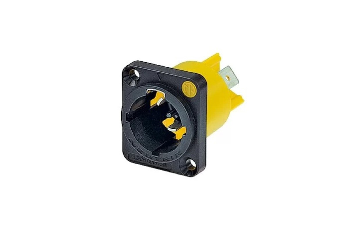 Панельный разъем powerCON TRUE1, 16 А, power IN (для входа питания), пыле- и влагозащищенный, класс защиты (IP65), фланец D-типа, 3-х контактный, штекер/папа, корпус - полиамид (PA), надежная система блокировки соединения, контакты - покрытие серебро подходит для проводов сечением до 2.5 мм2 (AWG 12), номинальное напряжением 250 В (переменное)/номинальный ток 16 А при сечении 2.5 мм2.