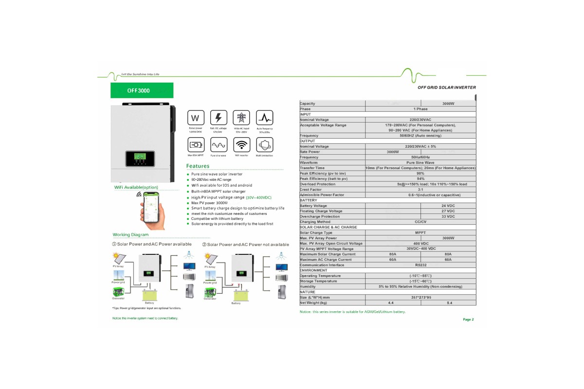 Солнечный инвертор OFF24V3000W – это надежное решение для автономного или резервного энергоснабжения. Поддерживает работу от солнечных панелей , городской сети 220В и аккумулятора 24В .