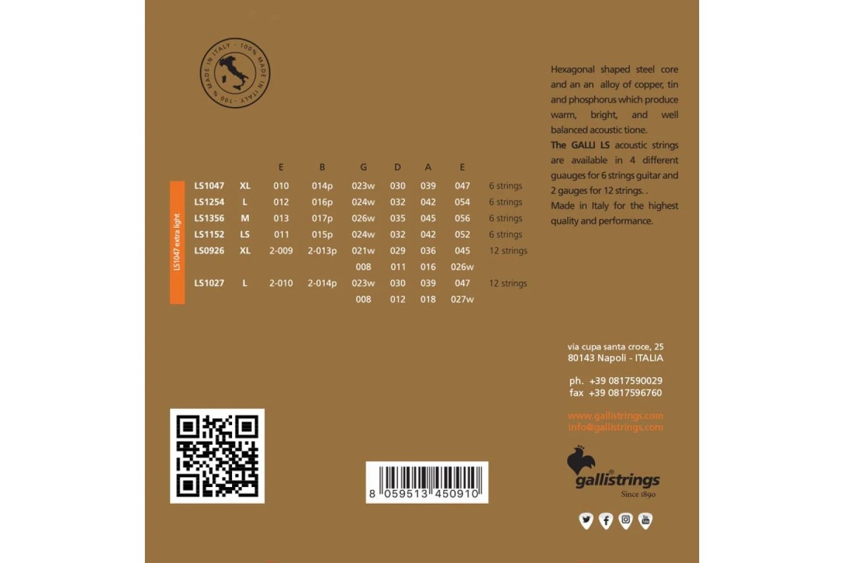 Струны Galli ® - набор из 6 шнуров EXTRA LIGHT, натяжение, фосфорная бронза, обмотка .010 – .047