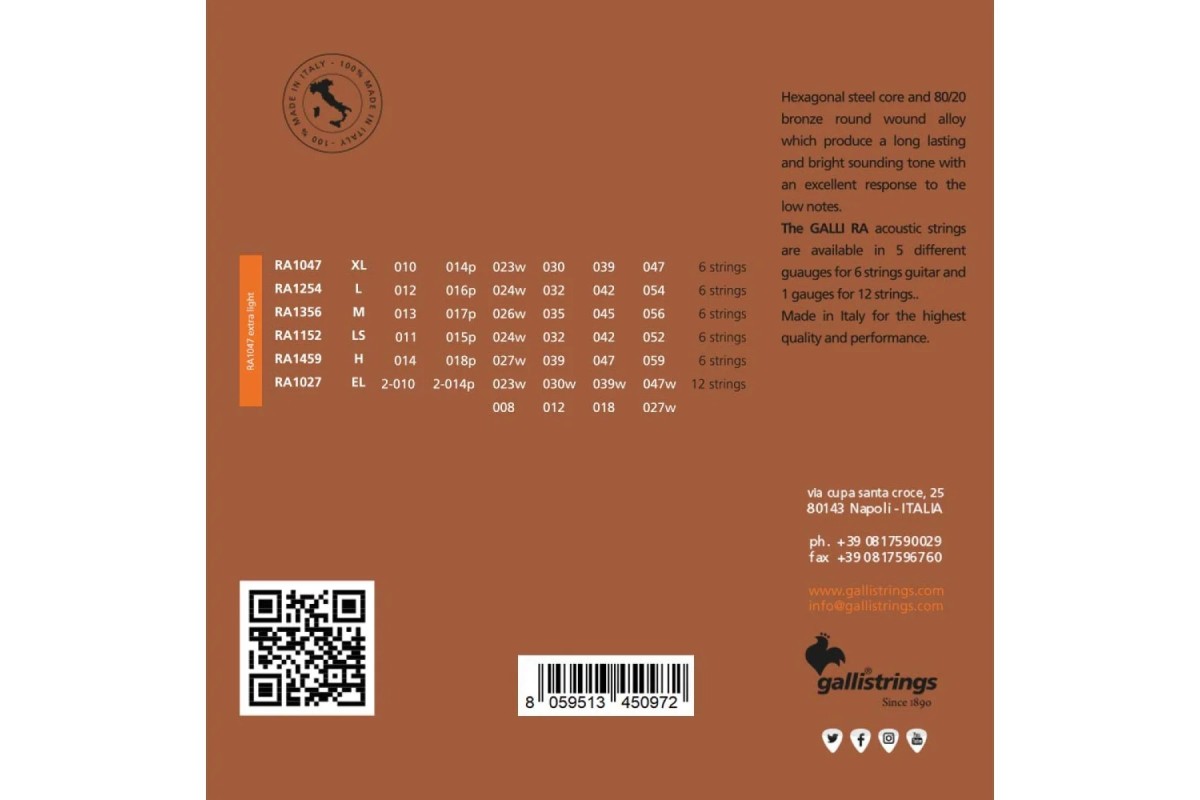 Струны Galli ® - набор из 6 струн EXTRA LIGHT, натяжение 80/20, бронзовая обмотка .010 – .047