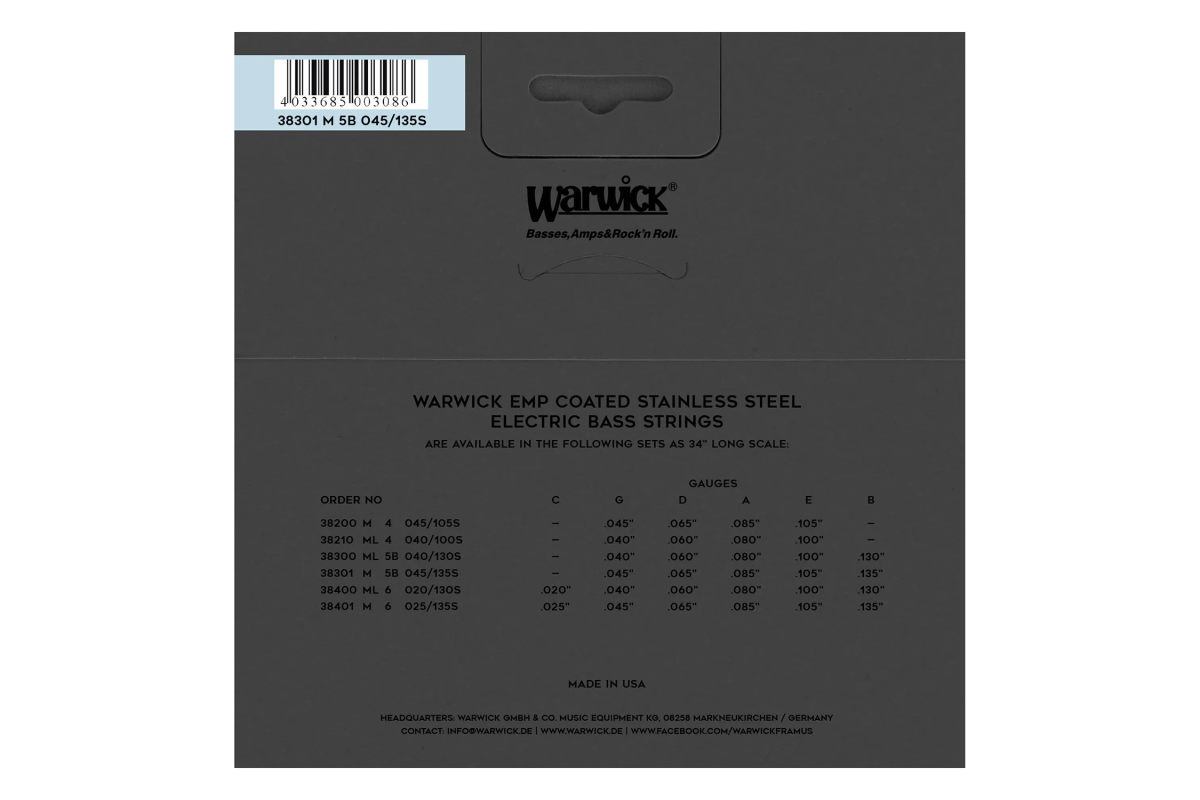Warwick 38301 EMP Medium 5-String (45-135) – профессиональные струны для 5-струнной бас-гитары, созданные с учетом требований современных музыкантов. Благодаря защитному покрытию EMP (Enhanced Molecular Protection) эти струны имеют продленный срок службы, сохраняют яркое звучание и защищены от коррозии и окисления.