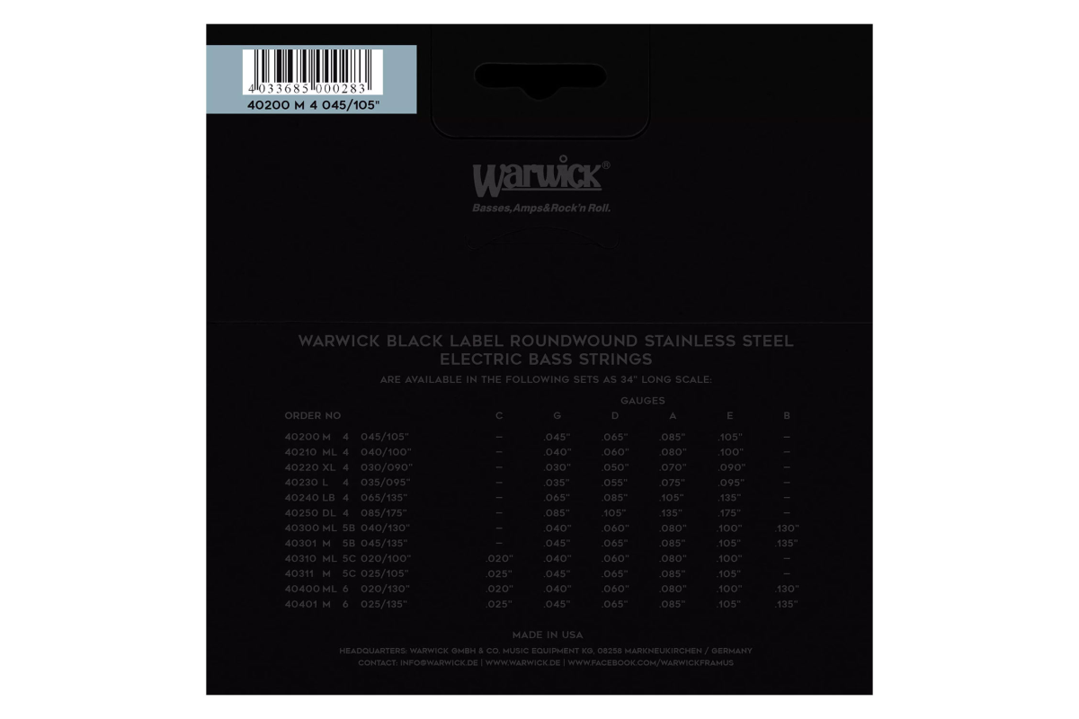 Warwick 40200 Black Label Medium 4-String (45-105) – профессиональный набор струн для бас-гитары, сочетающий прочность, динамичный звук и комфорт игры. Изготовленные из нержавеющей стали на шестигранном сердечнике , эти струны имеют яркое, агрессивное звучание, подчеркивающее фирменный тембр Warwick.