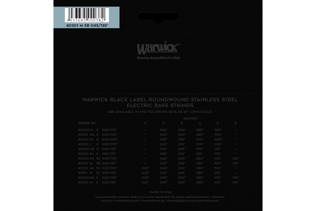 Серия Black Label предназначена для музыкантов, которые ценят широкий динамический диапазон и выразительность тона. Конусная (tapered) пятая струна B (Си) гарантирует четкий и мощный низ без потери атаки. Эти струны по умолчанию устанавливаются на немецкие Warwick серии Teambuilt .