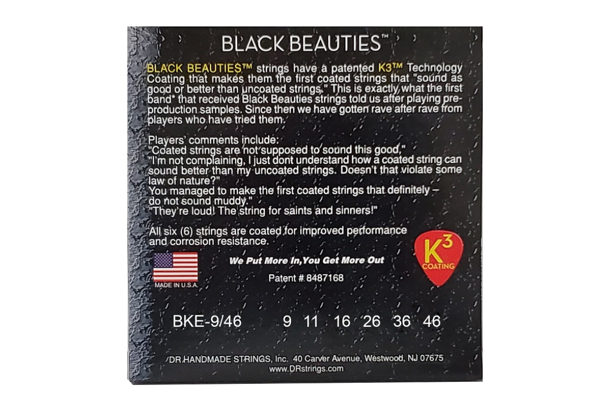 Они имеют обмотку из никелированной стали на шестигранном сердечнике для сохранения яркости и ощущения. Все струны имеют черную версию сверхтвердого покрытия DR K3™. Музыканты говорят, что эти струны имеют более длительный срок службы, большую проекцию, большую ясность, лучшую артикуляцию и меньше нежелательных обертонов, чем струны без покрытия.