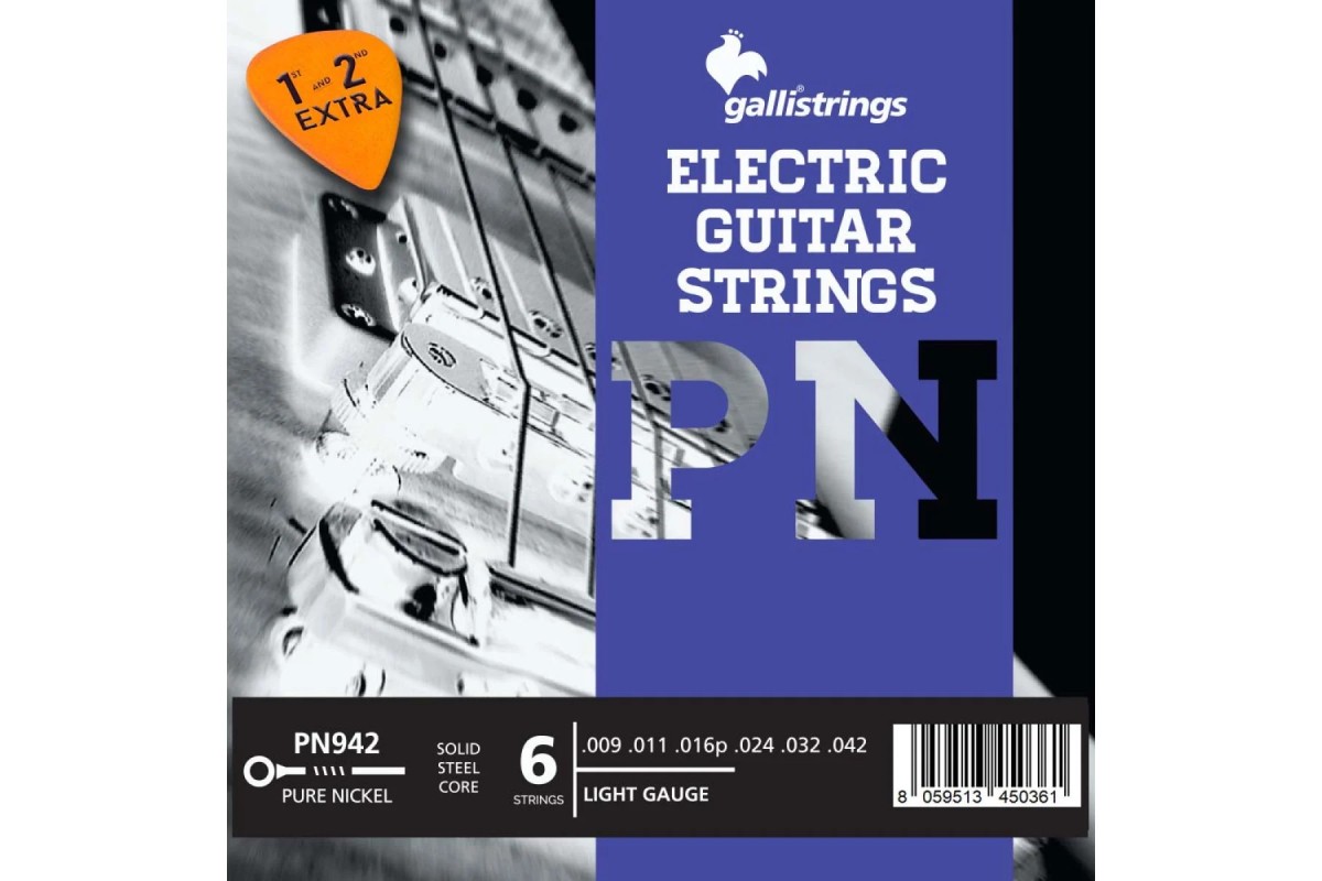 Gallistrings PN942 – набор из 6 струн легкого натяжения, круглая обмотка, калибр 009 – .042. Чистый никель, альтернатива более яркому тону никелированных. Эти струны обеспечивают теплое и винтажное звучание, идеально подходящее для традиционного блюза, классического рока, рокабилли и многое другое. 1-я и 2-я струны сдвоенные. Упакованы в новую упаковку, которая защищает их от любого загрязнения окружающей среды. В комплект входит медиатор.