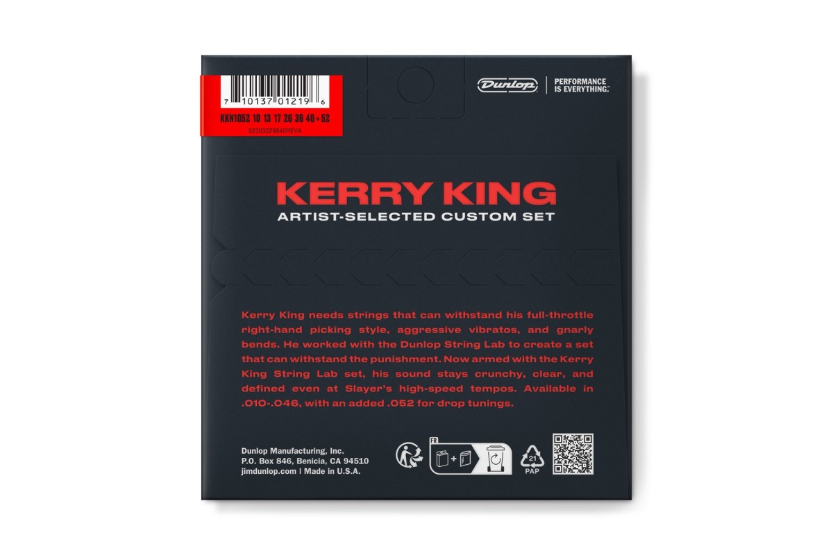 Dunlop KKN1052 – підписна серія струн Kerry King Icon Series, створена спільно з легендарним гітаристом Slayer, Керрі Кінгом. Набір розроблений для гітаристів, які потребують максимальної надійності, витривалості та чіткого звучання навіть під найшвидшою грою.