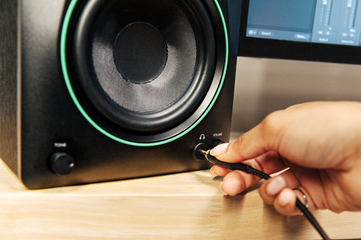 Подключайте аудиоинтерфейсы, микшеры, проигрыватели и другие устройства через входы TRS, RCA и 3,5 мм. Переключайтесь на наушники с помощью встроенного выхода для наушников – просто подключите их, чтобы отключить звук динамиков и слушать в тишине.