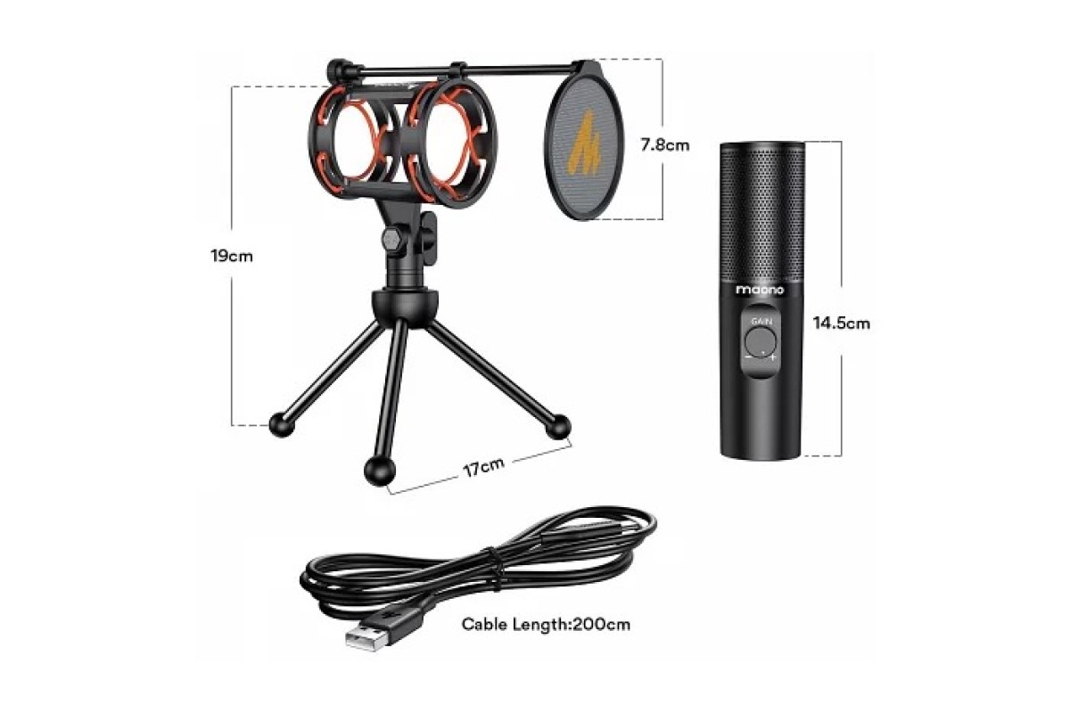 Микрофон Maono PM471TS подключается к ноутбуку или стационарному компьютеру с помощью 2-метрового кабеля. Такое расстояние подключения гарантирует пользователю необходимую свободу перемещения. Помимо подвеса и стойки в комплектацию микрофона входит поп-фильтр. Задачей этого устройства является минимизация помех от дыхания.