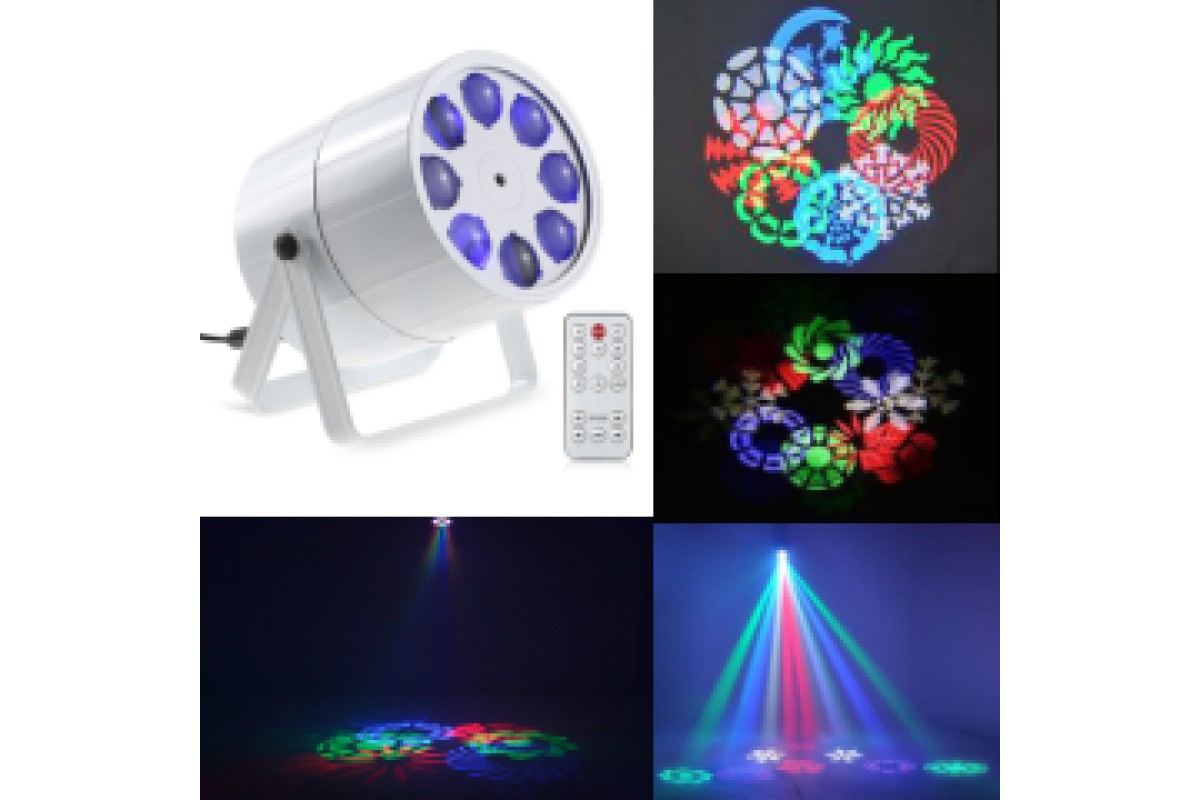 Прилад оснащений 8 гобо-трафаретами, що дозволяє легко змінювати візерунки і створювати різноманітні світлові композиції. Джерело світла складається з 8 потужних 5-ватних RGBW світлодіодів, що гарантують насичене багатобарвне світло. Вбудовані автоматичні програми і звукова активація дозволяють синхронізувати світлові ефекти з музикою, а пульт ДУ і DMX керування (8 каналів) забезпечують повний контроль над приладом.
