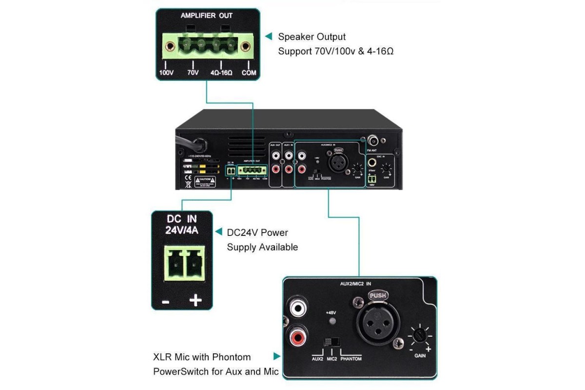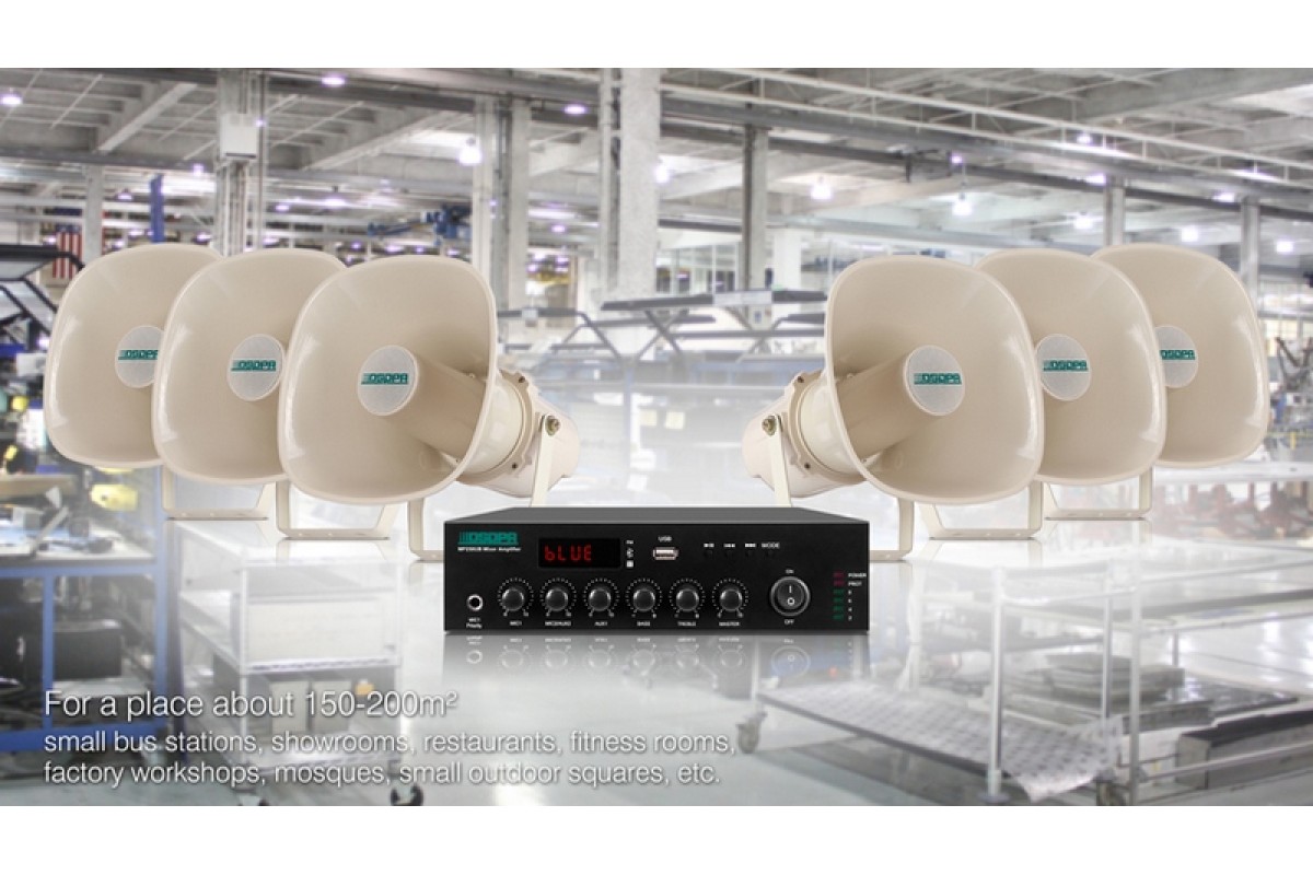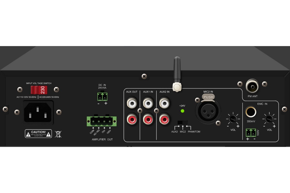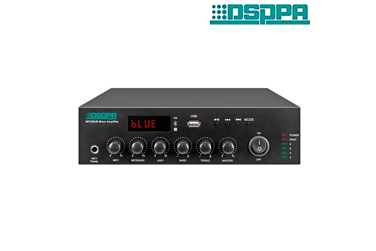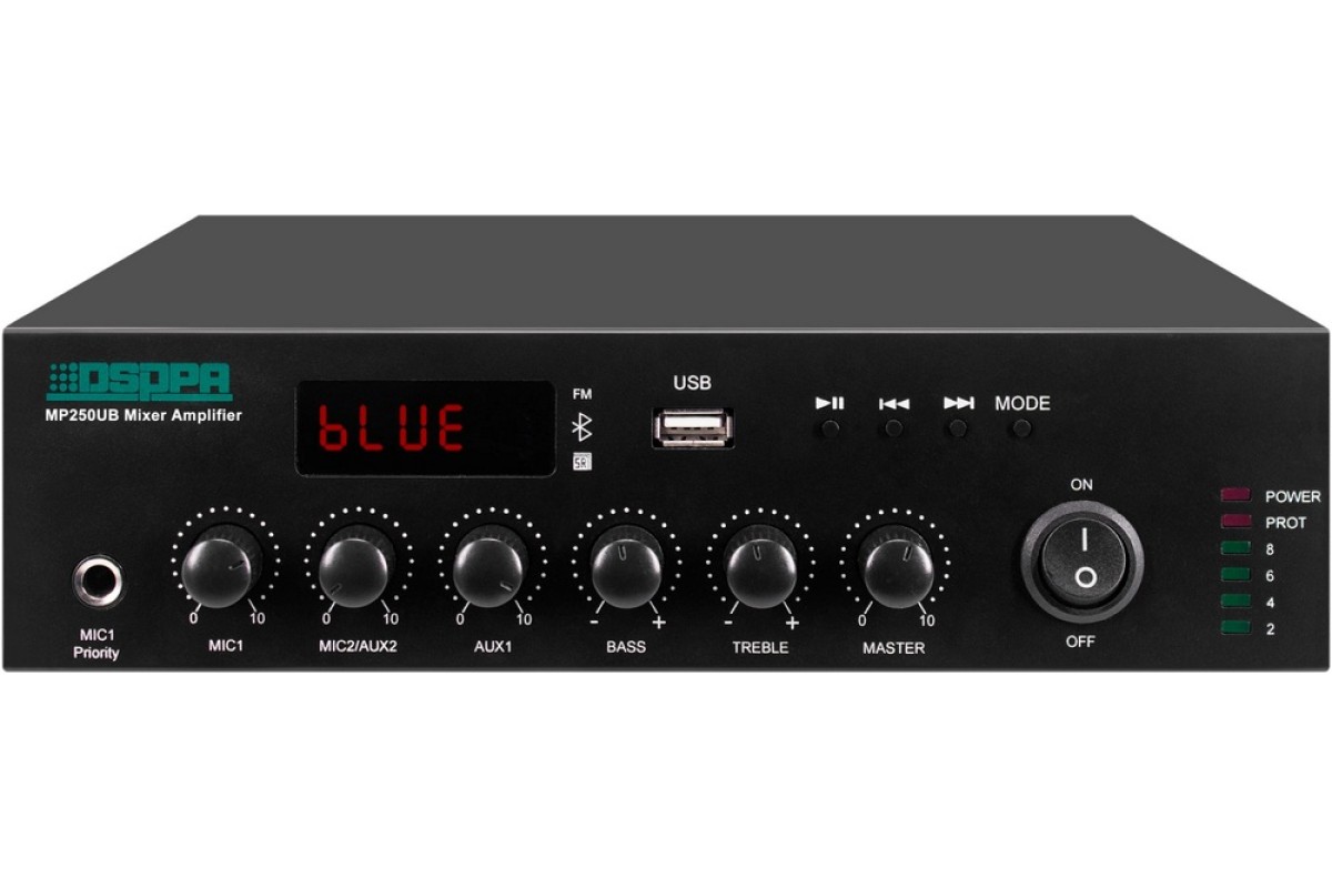 MP250UB – это компактный микширующий мини-усилитель со встроенными MP3-плеером, FM-радио и Bluetooth с пультом дистанционного управления. Выходная мощность 250 Вт в 70В/100В режимах или при низкоомном соединении в 4-16 Ом. Вход: Aux, Miс1 – 6.3 мм разъем на передней панели, Mic2 – XLR на задней панели (доступно фантомное питание для Mic2). Каждый из этих каналов снабжен индивидуальным регулятором громкости, а также регуляторы управления Bass и Treble. DSPPA MP250UB подходит для применения в небольших залах, магазинах, кафе, ресторанах и т.д.
