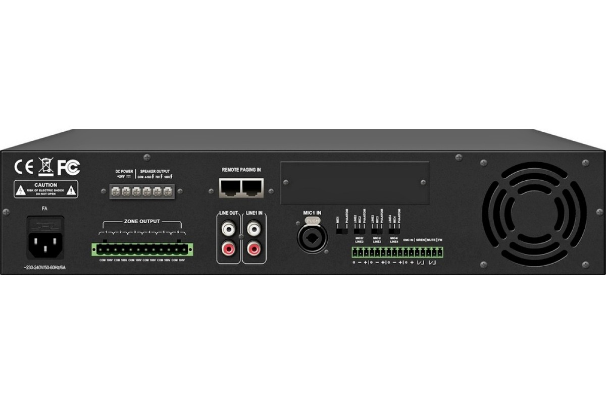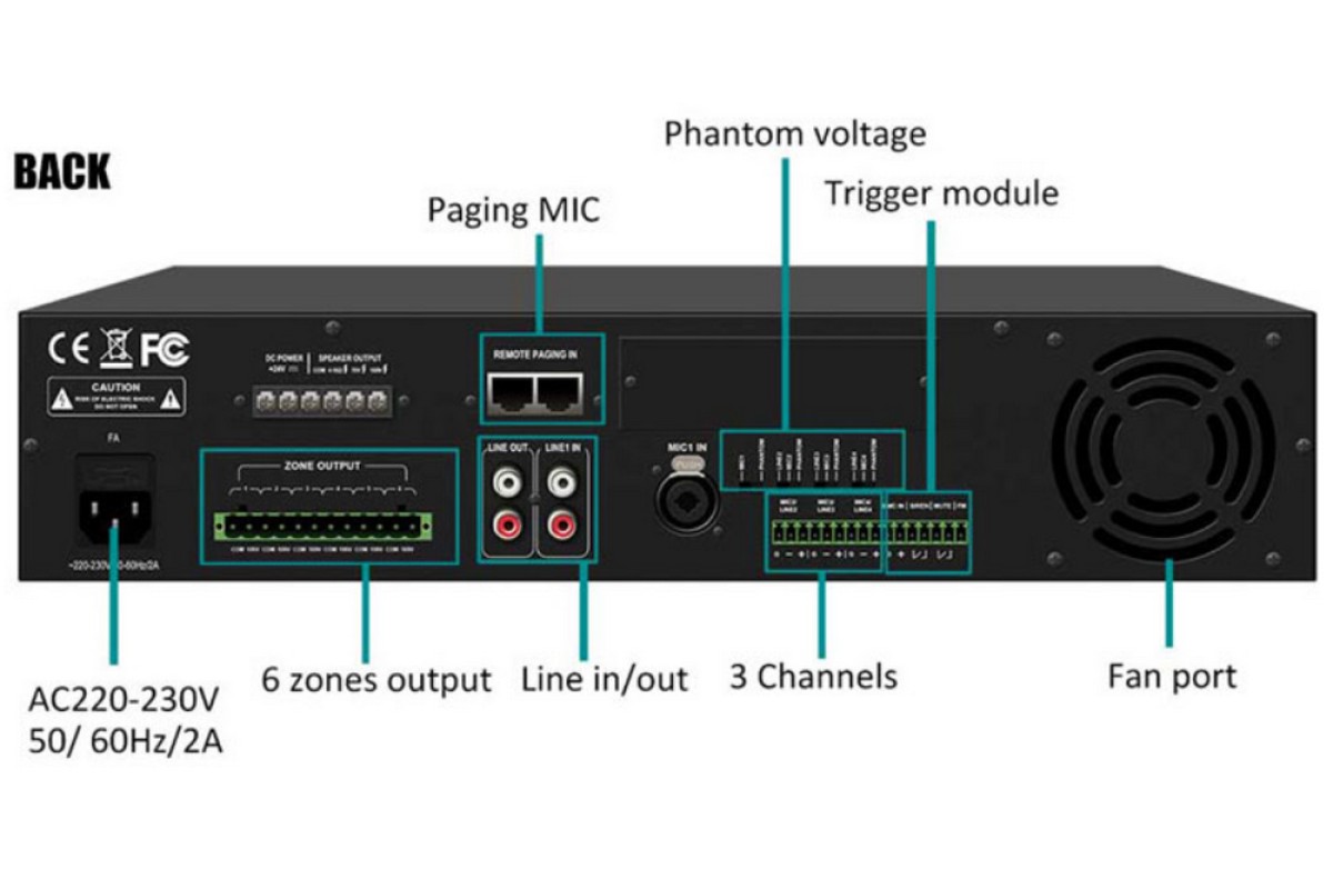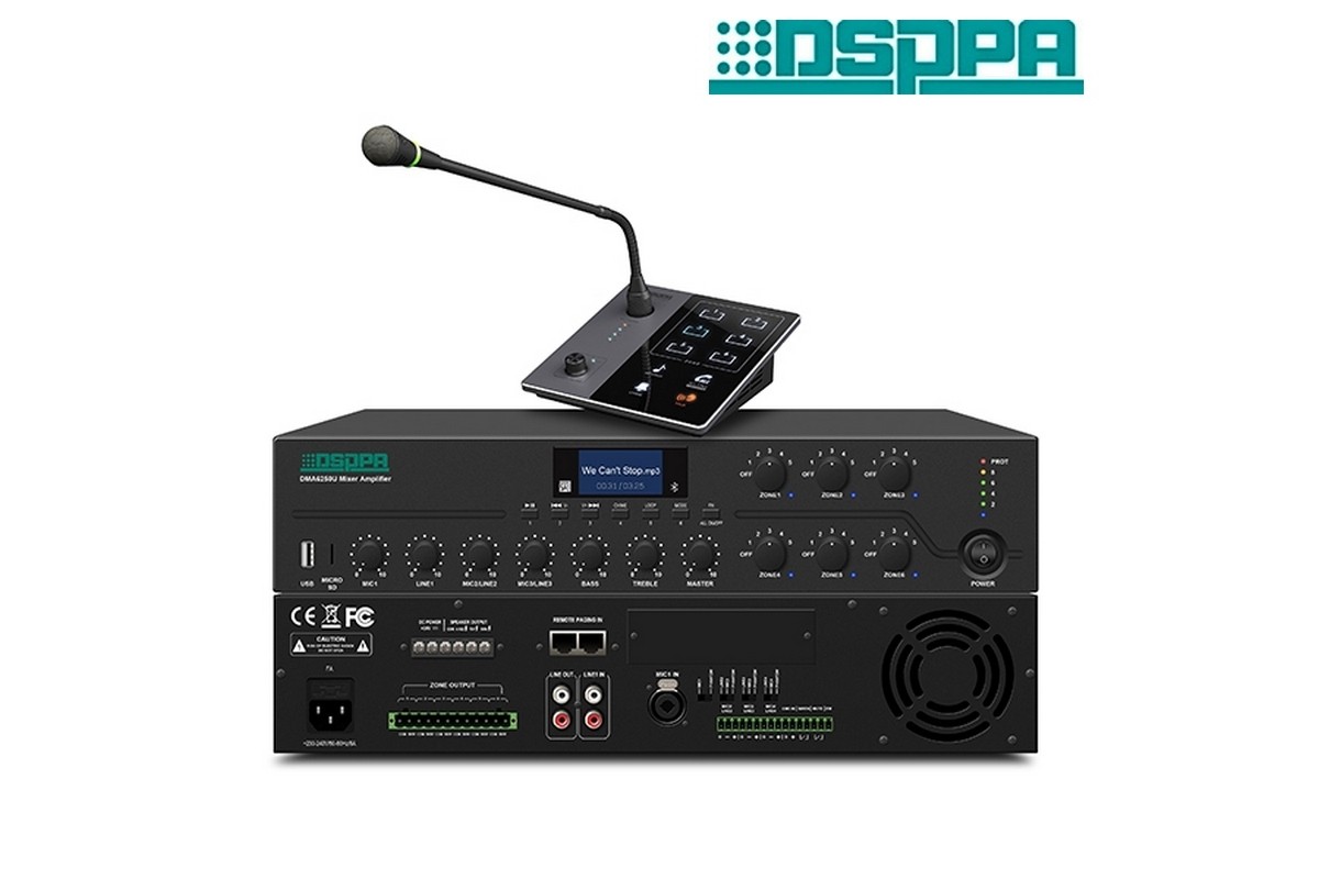Цифровой микшерный усилитель DMA6350U можно использовать вместе со станцией удаленного пейджинга DMA20, поддерживающей 2-канальный микрофон удаленного пейджинга с разъемом RJ-45. Усилитель имеет экран для интуитивно понятного отображения с такими источниками входного сигнала, как 4 микрофона, 4 AUX, USB, FM, Bluetooth и TF. Он также обеспечивает функцию защиты при перегрузке, коротком замыкании и превышении температуры. Это усилитель, объединяющий множество функций удовлетворения потребностей пользователей.