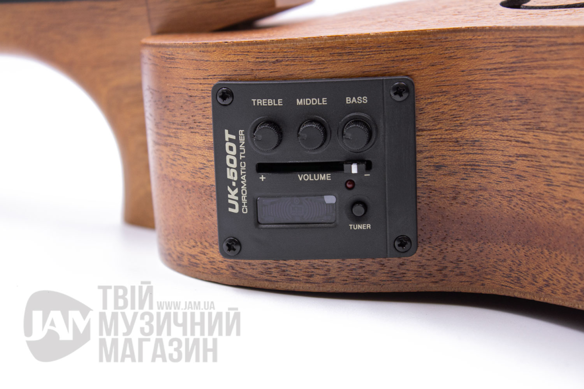 FZU31EQ оснащен подпорожковым пьезозвукоснимателем и активным усилителем. Трехполосный эквалайзер дает возможность подробно отстроить тембр звучания инструмента, а встроенный хроматический тюнер имеет дисплей с подсветкой и позволяет легко настроить укулеле даже на темной сцене.