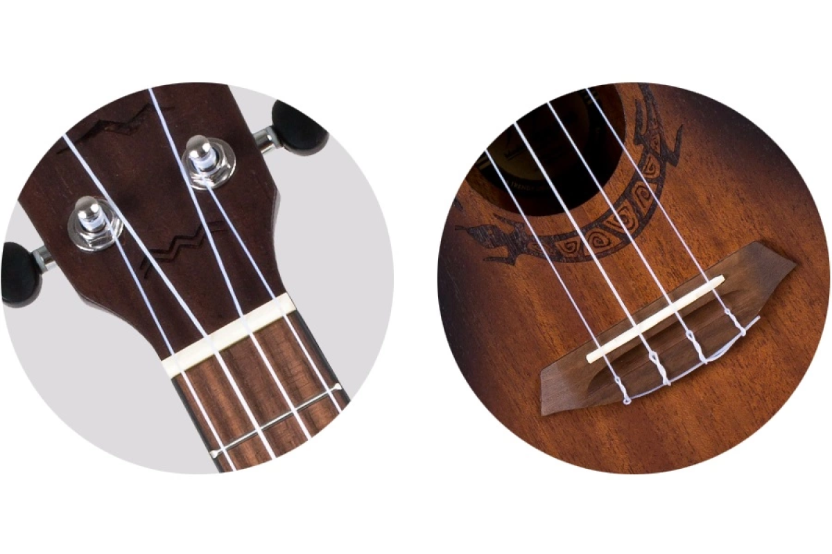Верхний и нижний порожки, возможно, и не слишком большие элементы укулеле, но они оказывают непосредственное влияние на чистоту звучания инструмента. Порожки этой укулеле сделаны из кости (не из пластика). Только одна эта деталь делает эту укулеле поистине уникальной.