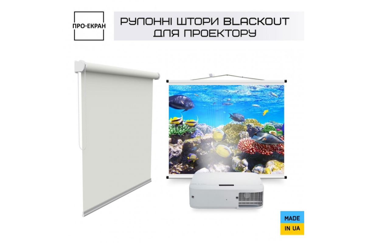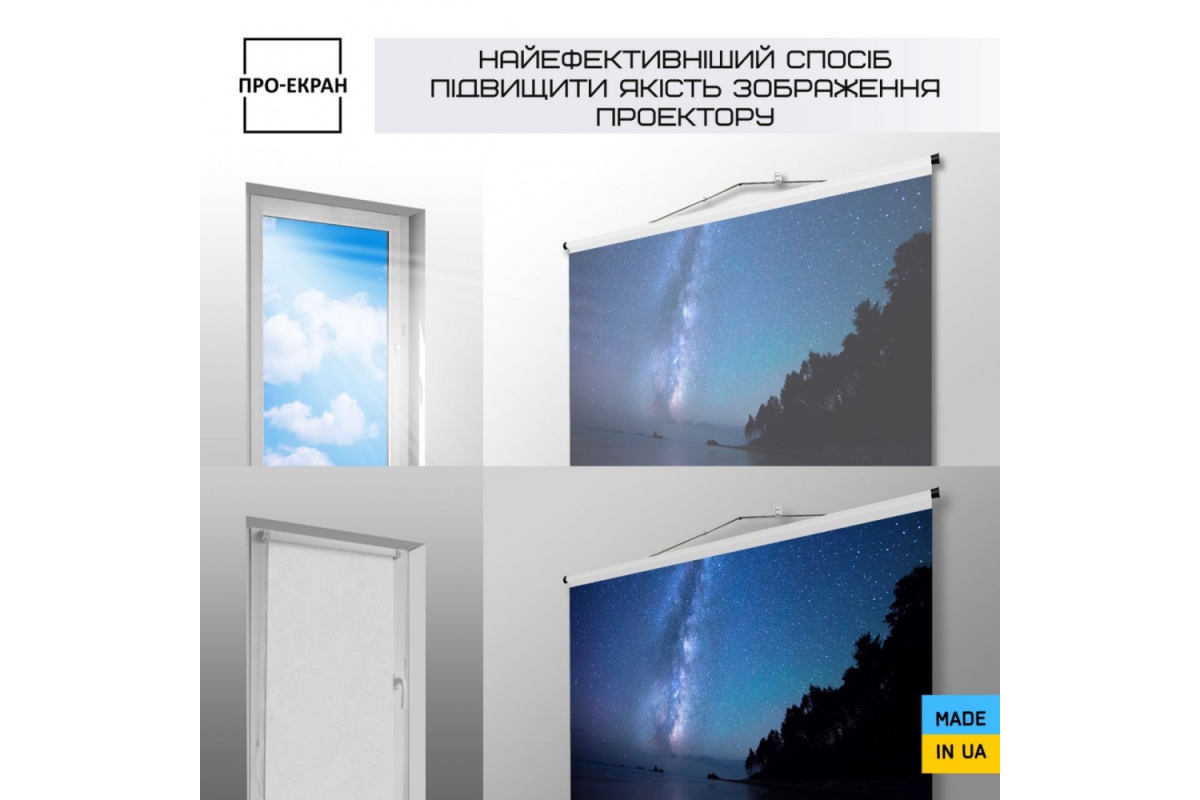 Рулонні штори ПРО-ЕКРАН розроблені спеціально для використання у якості затемнення у денний час при використанні проектору. Навіть самий яскравий, якісний проектор не дасть вам гарного зображення у сонячний день, тому рекомендуємо використовувати данні штори з матеріалу Blockout, який забезпечує 100% світлонепроникність
