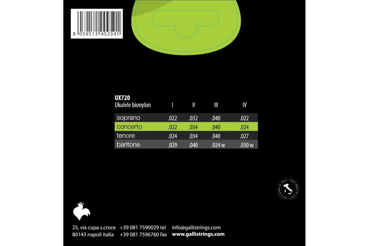 Gallistrings UX720 - струни для укулеле, ідеальний вибір для концерт укулеле. Комплект з 4 струн виготовлений з високоякісного біонейлону, що гарантує чистий звук та довговічність. Вироблені в Італії, ці струни втілюють в собі традиції майстерності і якості, даруючи неперевершений музичний досвід.