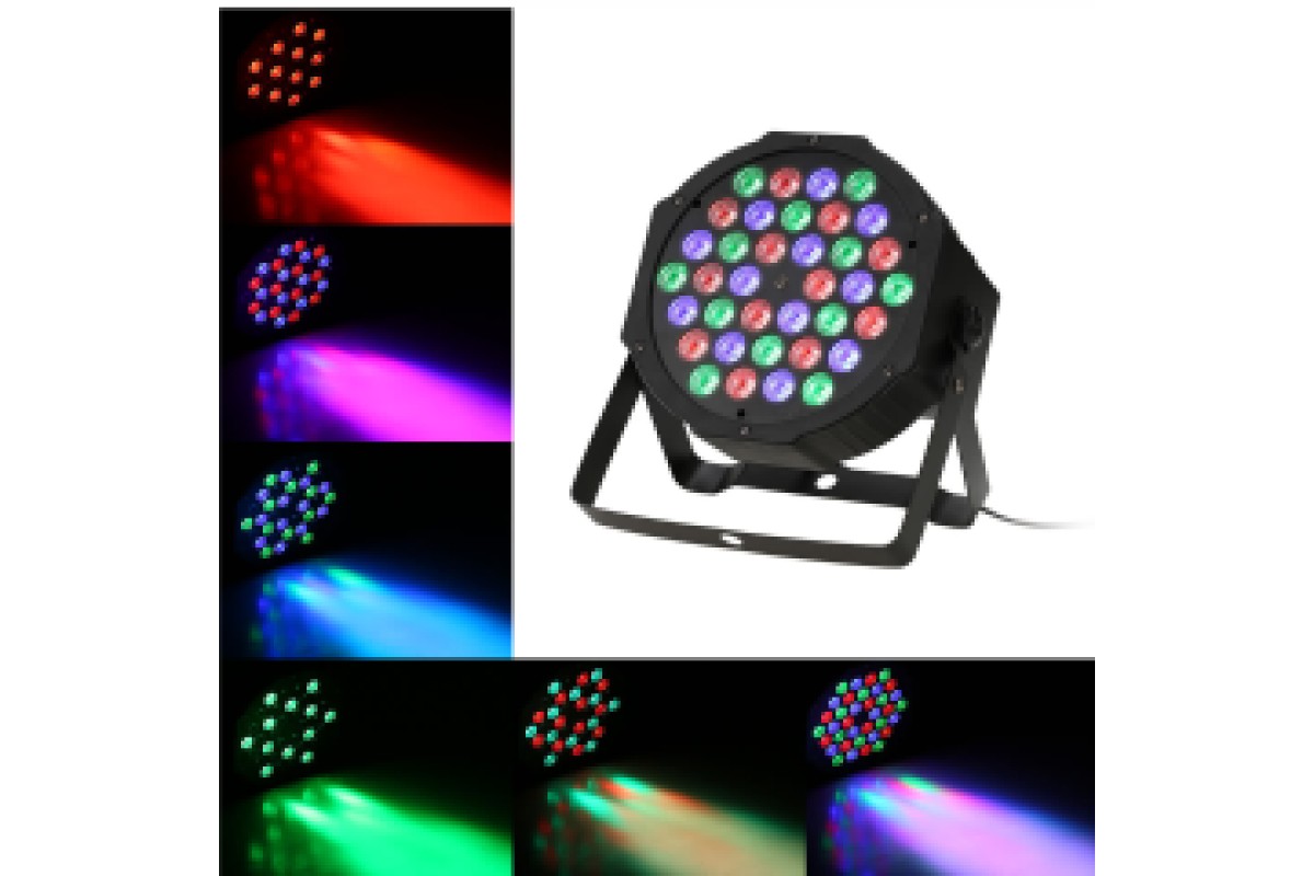 BIG SLIM PAR 36 × 3W — компактний LED прожектор для професійного та домашнього використання. Оснащений 36 потужними світлодіодами RGB (по 12 червоних, зелених та синіх), забезпечує насичене кольорове освітлення і створює яскраві динамічні ефекти для вечірок, сценічних шоу та дискотек.