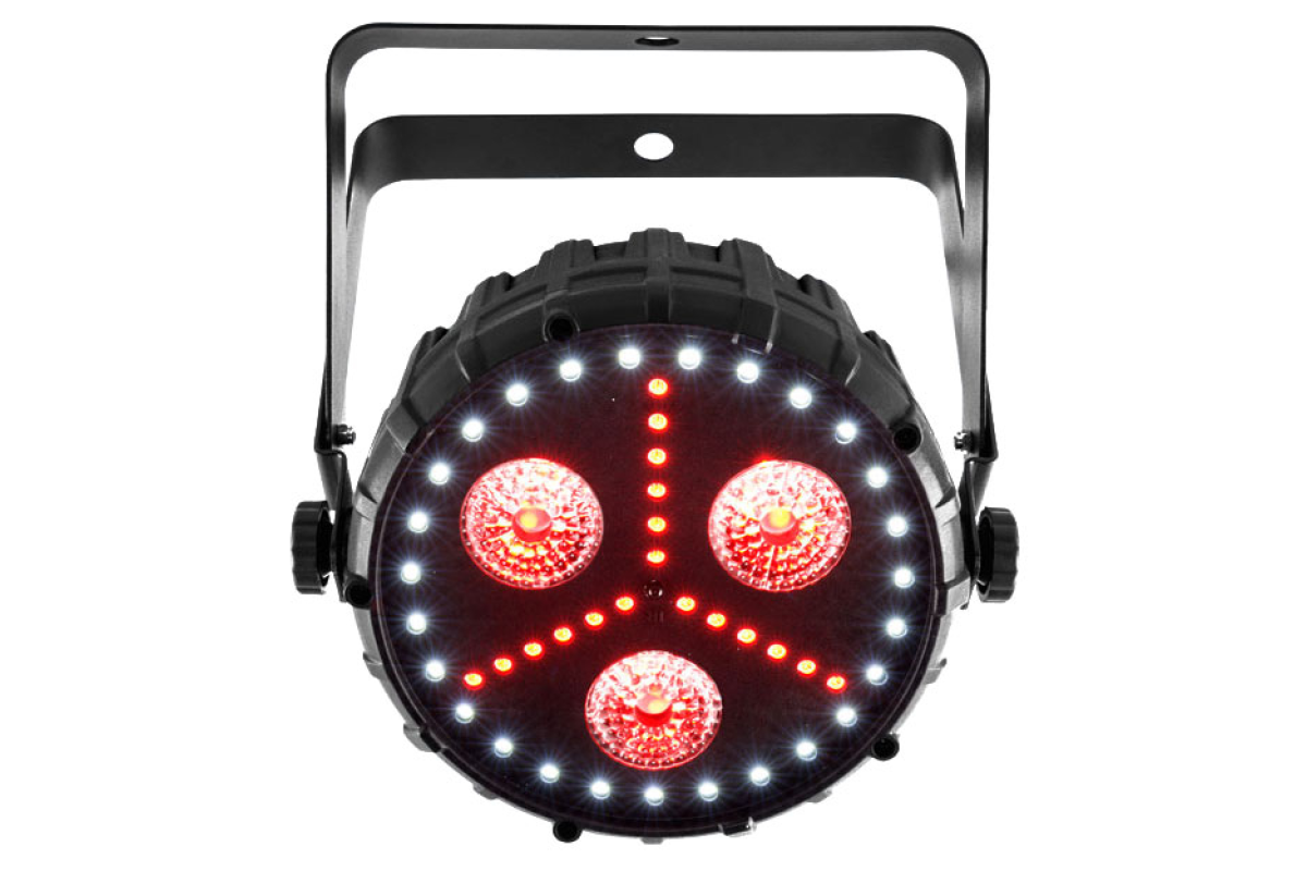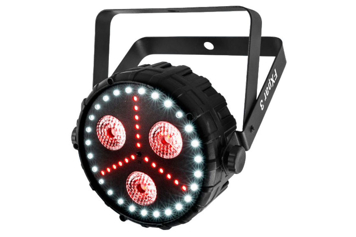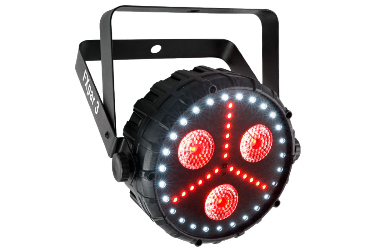 FXpar 3 оснащений трьома 4-кольоровими (RGB + UV) світлодіодами потужністю 8Вт, розташованими в центрі. На додаток до цього прилад має RGB SMD світлодіодне підсвічування і яскравий кільцевої SMD стробоскоп. Завдяки тому, що кожним модулем FXpar 3 можна управляти індивідуально, ви зможете легко створювати захоплюючі ефекти. Звукова активація, автоматичні програми, підтримка DMX і можливість управління за допомогою опціонального інфрачервоного пульта IRC-6, забезпечують неймовірну гнучкість, зручність і дозволяють за лічені секунди створити унікальне ефектне світлове шоу!