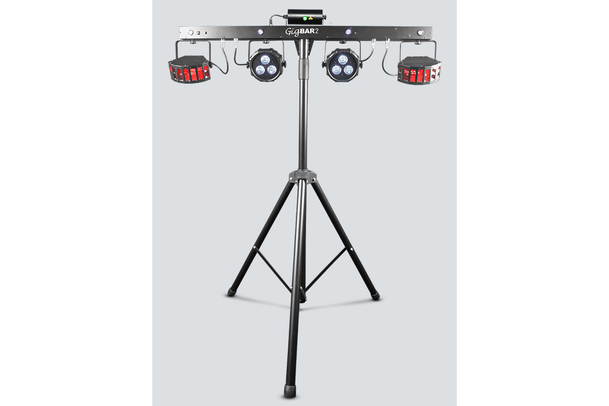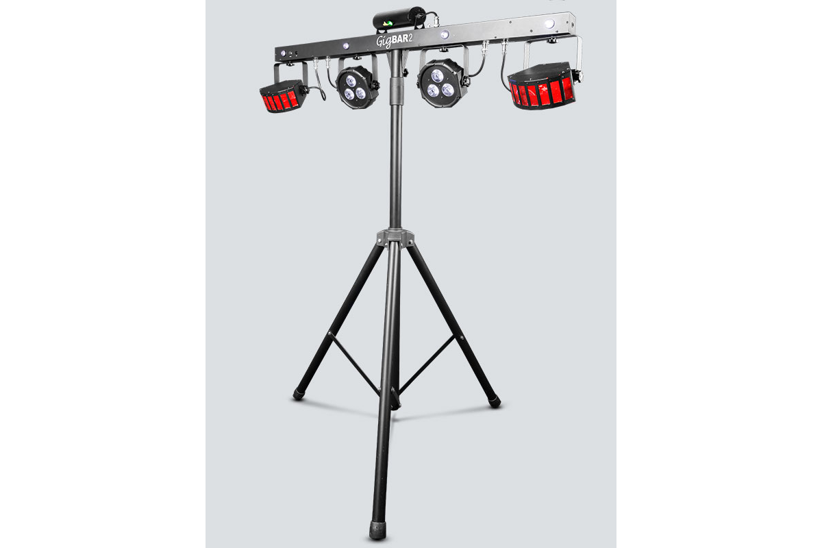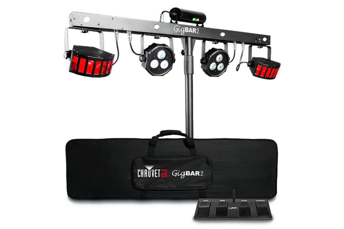 Chauvet GigBAR 2.0 – це мобільна світлова система «все-в-одному», яка поєднує відразу кілька ефектів: 2 LED Derby, ультрафіолетову заливку, червоний/зелений лазер та 4 яскраві стробоскопи. Усі прилади змонтовані на одній стійці, що робить комплект максимально зручним для виступів і вечірок.
