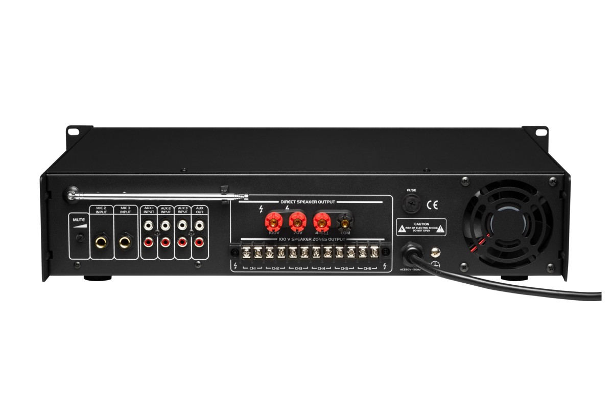 Мікшируючий підсилювач потужності DV audio MA-650.6P з вбудованим USB-програвачем, 6-зон, FM-тюнер, BLUETOOTH і можливістю роздільного зонування на 6 зон. Застосовується в системах фонового озвучування. Оснащений трьома мікрофонними входами, трьома лінійними входами і лінійним виходом. Так само оснащений 6-регуляторами рівня гучності кожної зоною .Управління USB-програвачем здійснюється за допомогою кнопок stop / play, повтор, попередній трек, наступний трек з лицьової панелі підсилювача або з допомогою пульта дистанційного керування, який входить в комплект поставки. USB-програвач підтримує USB-флешки максимальним об'ємом пам'яті до 16Гб. Підсилювач оснащений автоматичною системою примусового охолодження: вентилятор спрацьовує при температурі 55 ° C. Підсилювач виконаний в стандартному 19-дюймовому корпусі висотою 2U для швидкого і зручного монтажу в рекову стійку.