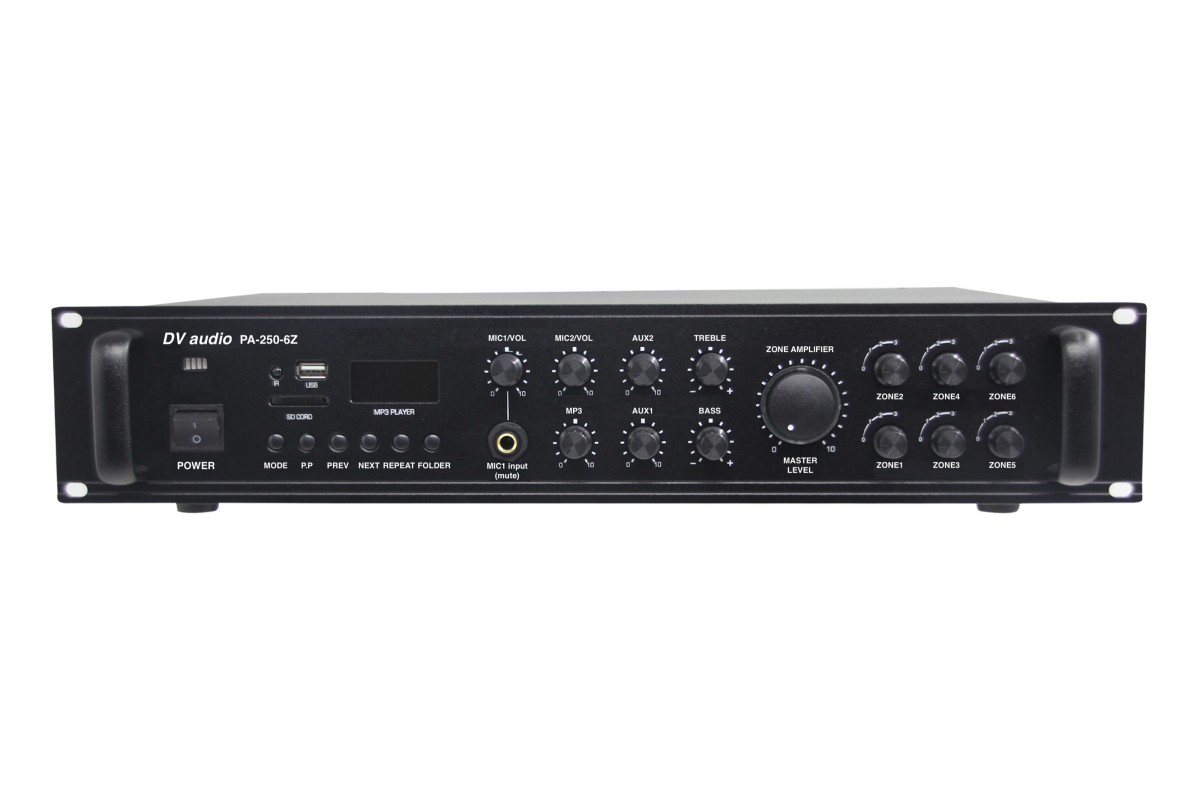 Мікшируючий підсилювач потужності DV audio PA-250-6Z з вбудованим USB-програвачем, 6-зон, FM-тюнер, BLUETOOTH і можливістю роздільного зонування на 6 зон. Застосовується в системах фонового озвучування. Оснащений трьома мікрофонними входами, трьома лінійними входами і лінійним виходом. Так само оснащений 6-регуляторами рівня гучності кожної зоною .Управління USB-програвачем здійснюється за допомогою кнопок stop / play, повтор, попередній трек, наступний трек з лицьової панелі підсилювача або з допомогою пульта дистанційного керування, який входить в комплект поставки. USB-програвач підтримує USB-флешки максимальним об'ємом пам'яті до 16Гб. Підсилювач оснащений автоматичною системою примусового охолодження: вентилятор спрацьовує при температурі 55 ° C. Підсилювач виконаний в стандартному 19-дюймовому корпусі висотою 2U для швидкого і зручного монтажу в рекову стійку.
