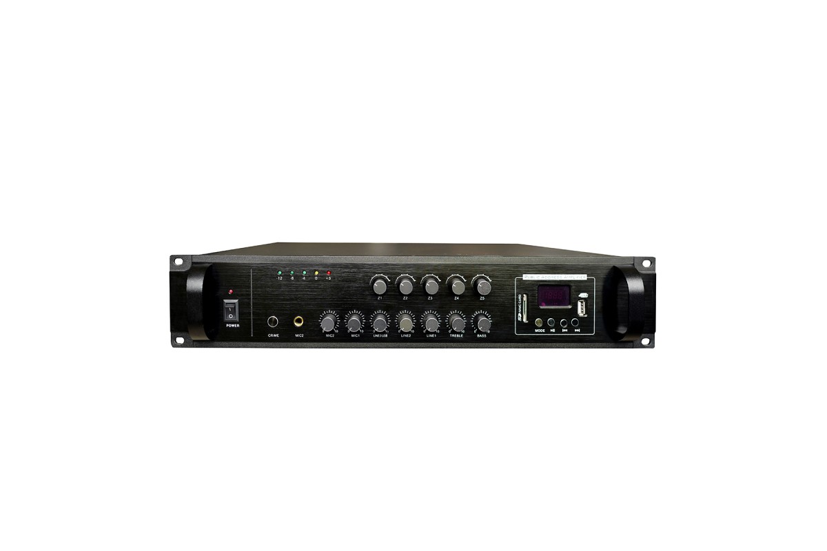 Підсилювач підтримує високоомні виходи 70V / 100V та низькоомний режим 4–16 Ом, тому сумісний із різними типами акустичних систем. Завдяки вбудованому MP3-плеєру, Bluetooth-модулю, FM-приймачу та SD-картрідеру, пристрій може відтворювати музику без підключення зовнішніх джерел сигналу.