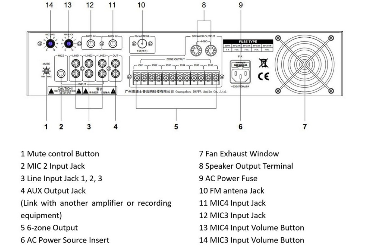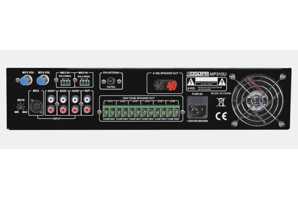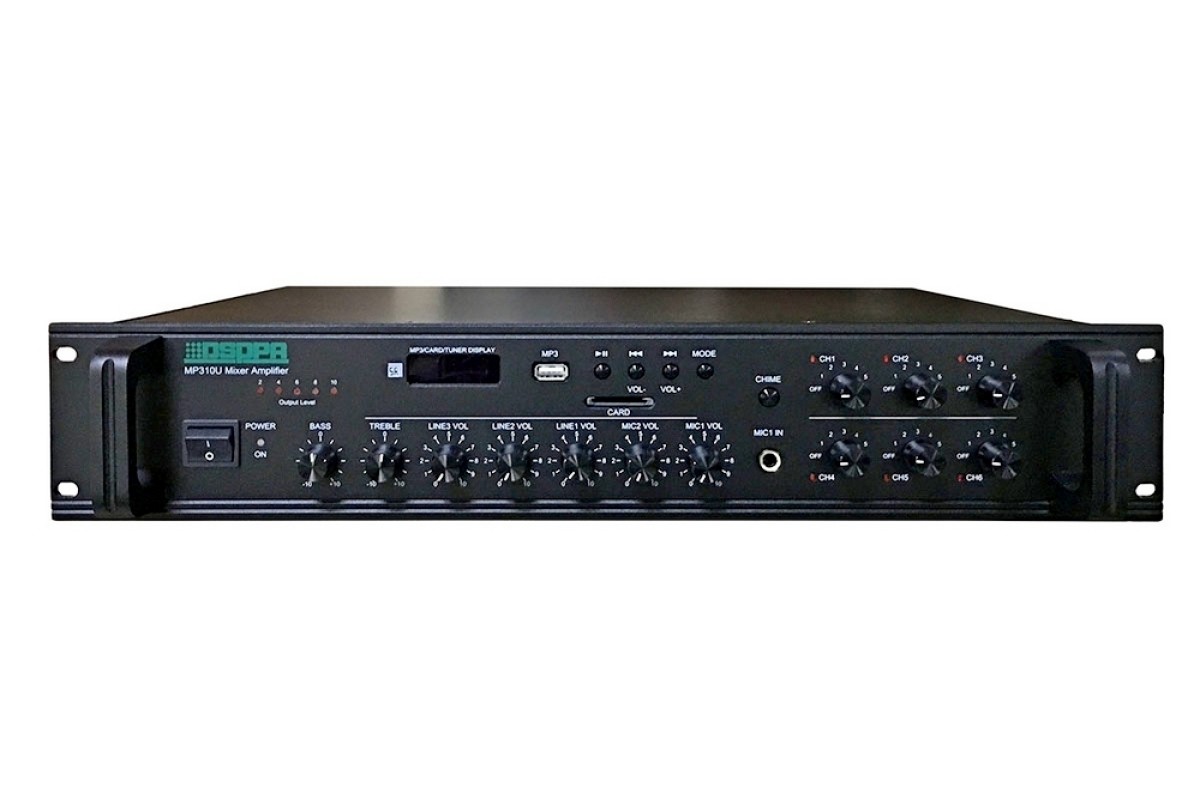 MP310U DSPPA – трансляційний підсилювач із вихідною напругою 100В, потужністю 120 Вт та селектором на 6 зон. Додатково є вихід 4-16 Ом для підключення низькоомних гучномовців.