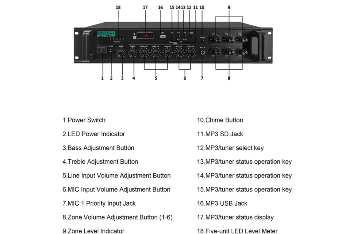 Підсилювач має 4 мікрофонні/3 лінійні входи і лінійний вихід для підключення зовнішніх підсилювачів потужності. Перший мікрофонний вхід має пріоритет і має можливість регулювання приглушення інших сигналів у підсилювачі. Сигнали з різних входів можна мікшувати. Селектор зон дозволяє транслювати звукову інформацію до різних зон. Наприклад, це можуть бути окремі поверхи будівлі, приміщення різного призначення, вулична парковка та ін. Селектор зон оснащений вбудованими атенюаторами для роздільного регулювання гучності в зонах оповіщення. Ця функція дозволяє встановити оптимальну гучність для гучномовців, встановлених у різних місцях. Наприклад, можна окремо налаштувати гучність звукової реклами у торговому залі та на вулиці. На передній панелі підсилювача знаходиться кнопка включення сигналу залучення "ГОНГ", розташовані регулятори вхідних сигналів при мікшуванні, регулятор загальної гучності та регулятори тембру окремо для високих та низьких частот, використання яких дозволяє налаштувати роботу пристрою залежно від контенту, що відтворюється. LED-індикація на передній панелі забезпечує швидкий візуальний моніторинг стану.