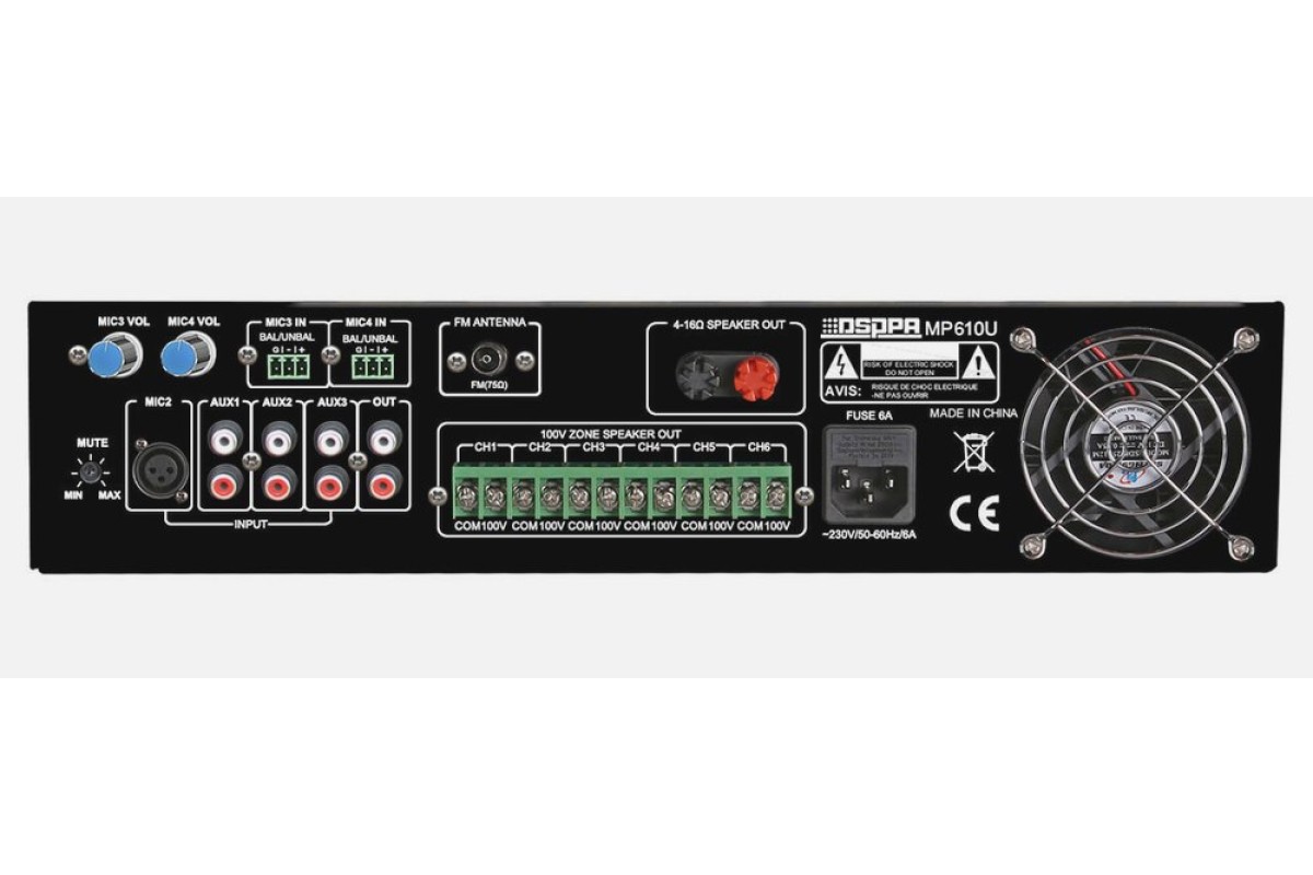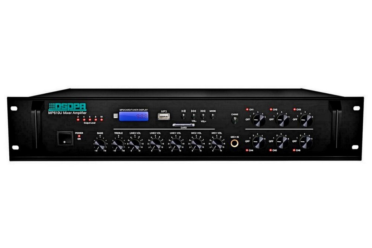 MP610U DSPPA – трансляційний підсилювач із вихідною напругою 100В, потужністю 250 Вт та селектором на 6 зон. Додатково є вихід 4-16 Ом для підключення низькоомних гучномовців.