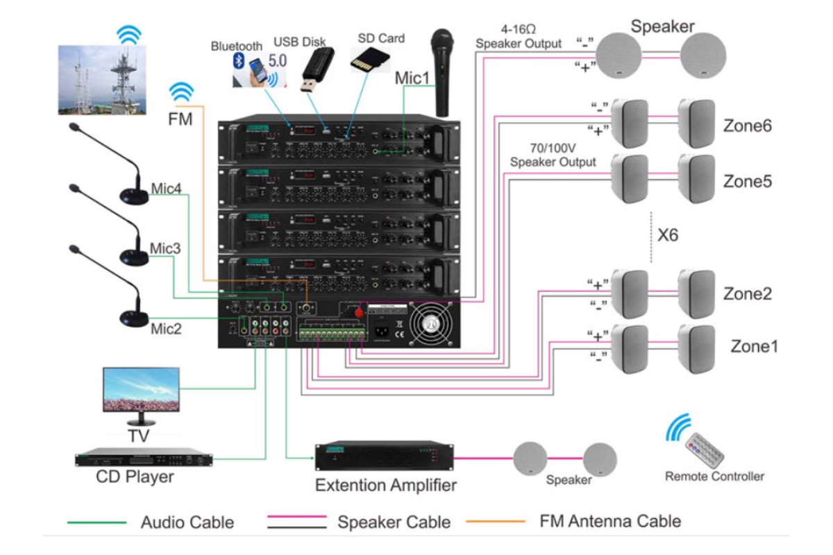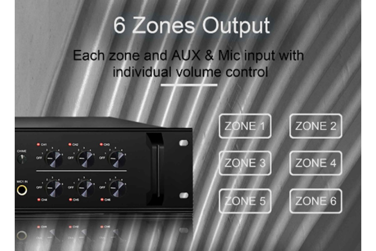 Шість зон трансляції з регулюванням рівня вихідного сигналу для кожної зони