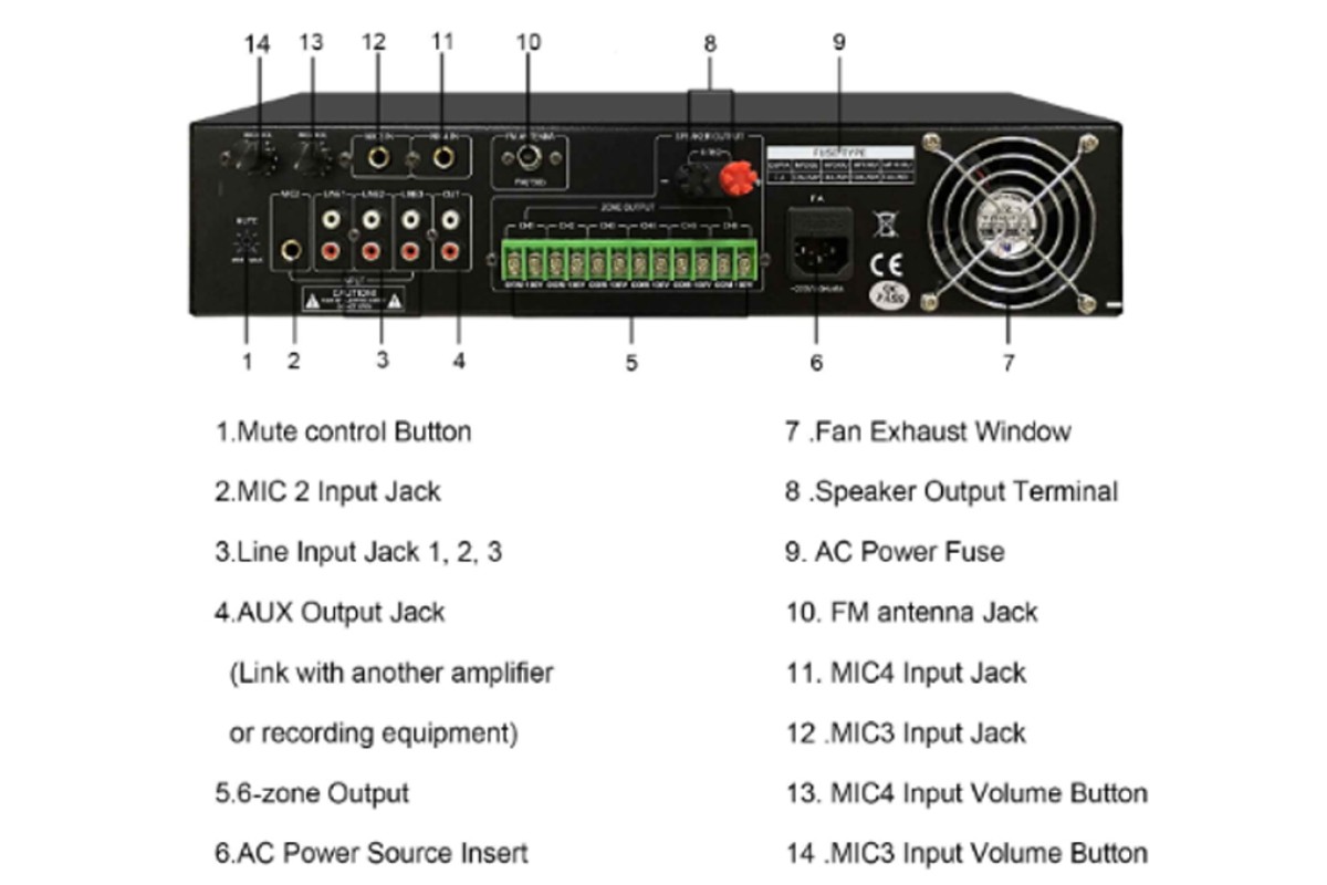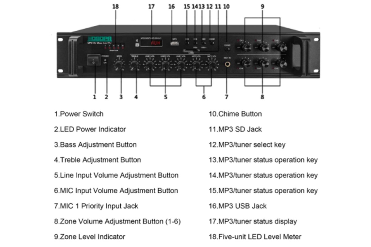 Підсилювач має 4 мікрофонні/3 лінійні входи і лінійний вихід для підключення зовнішніх підсилювачів потужності. Перший мікрофонний вхід має пріоритет і має можливість регулювання приглушення інших сигналів у підсилювачі. Сигнали з різних входів можна мікшувати. Селектор зон дозволяє транслювати звукову інформацію до різних зон. Наприклад, це можуть бути окремі поверхи будівлі, приміщення різного призначення, вулична парковка та ін. Селектор зон оснащений вбудованими атенюаторами для роздільного регулювання гучності в зонах оповіщення. Ця функція дозволяє встановити оптимальну гучність для гучномовців, встановлених у різних місцях. Наприклад, можна окремо налаштувати гучність звукової реклами у торговому залі та на вулиці. На передній панелі підсилювача знаходиться кнопка включення сигналу залучення "ГОНГ", розташовані регулятори вхідних сигналів при мікшуванні, регулятор загальної гучності та регулятори тембру окремо для високих та низьких частот, використання яких дозволяє налаштувати роботу пристрою залежно від контенту, що відтворюється. LED-індикація на лицьовій панелі забезпечує швидкий візуальний моніторинг стану.