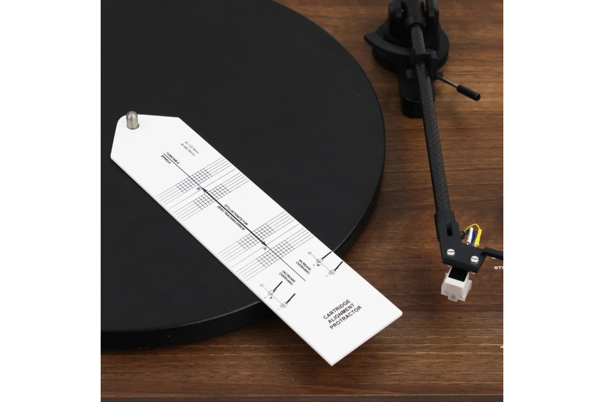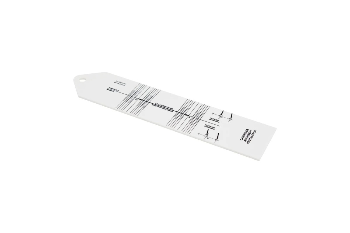 Транспортир GOKA GK-R36A забезпечує точне вирівнювання картриджа вінілового програвача для досягнення найкращої якості звуку та запобігання передчасному зносу платівок. Він виготовлений із білого акрилу та оснащений отвором для шпинделя програвача.