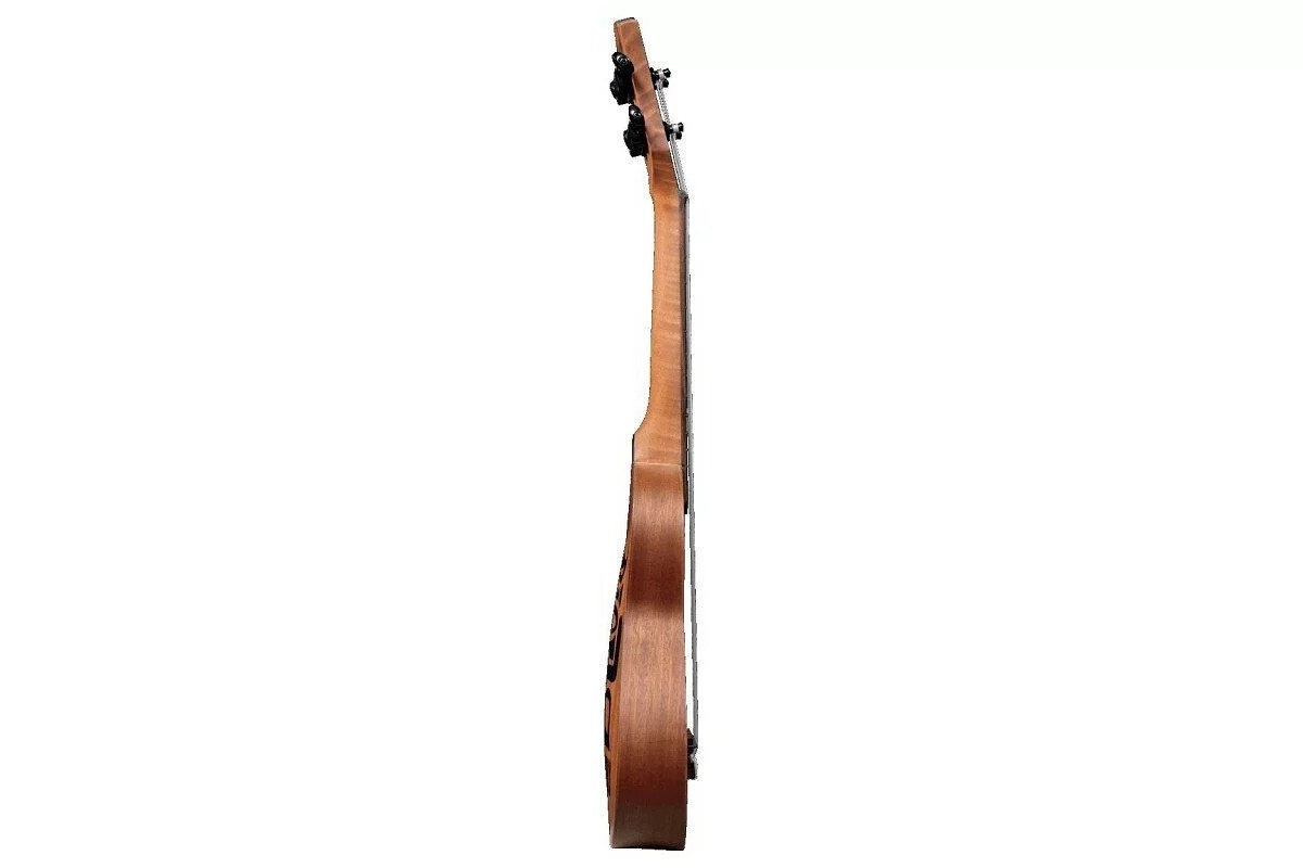 Сопрано укулеле LAG BABYTKU110S має витончений корпус і неординарний дизайн на основі поєднання червоно-чорних фактур дерева і тату-принтів. Матова лакування корпусу, залишає відкритими пори деревини, дає приголомшливо енергійний звук. Верхня дека з масиву сапеле і вигнутий конструктив задньої деки підсилює і робить багатшими звучання інструмент.