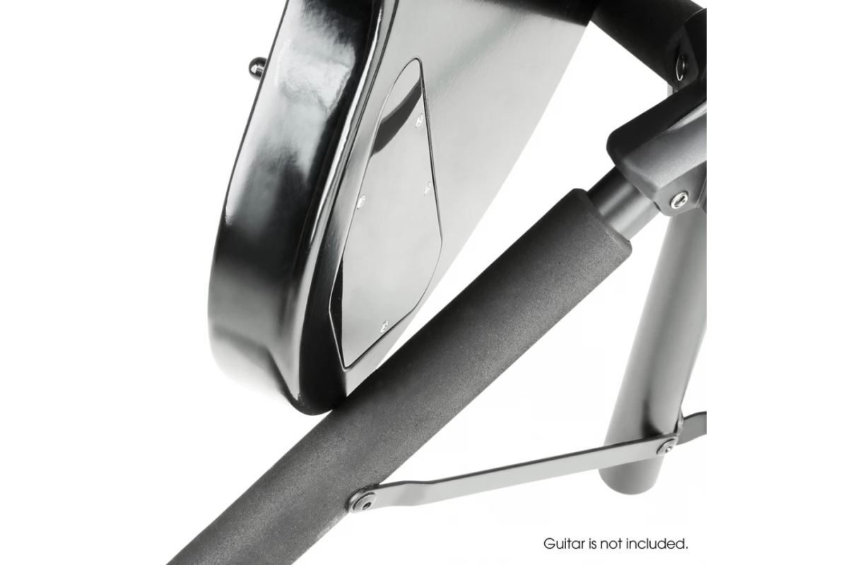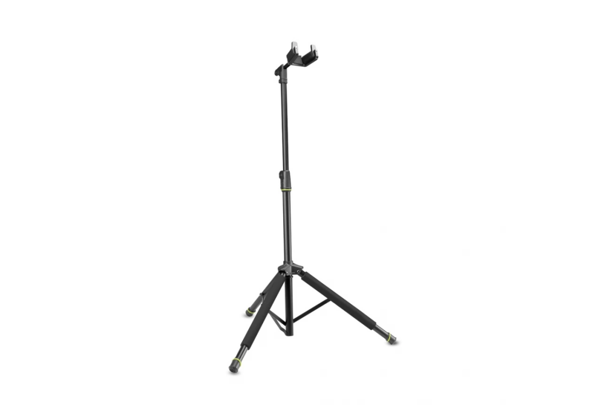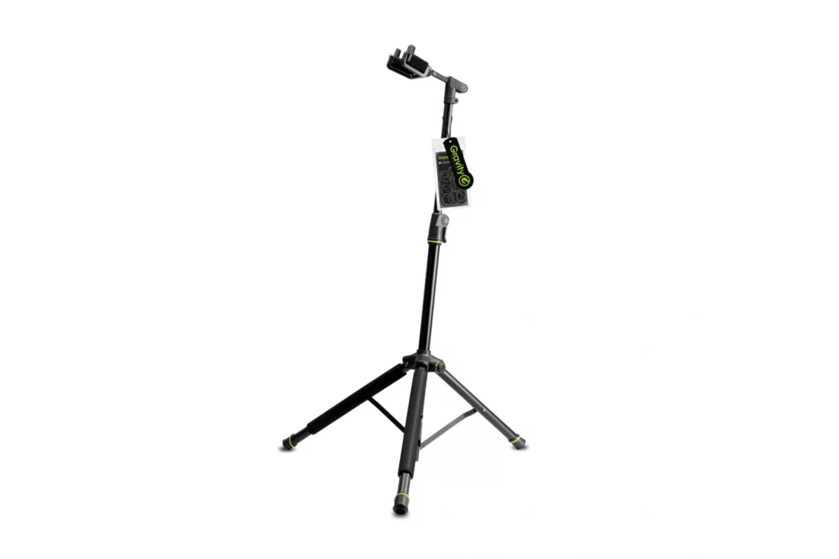 GS 01 NHB - це надійна і елегантна гітарна стійка для акустичних, електричних і бас-гітар. Регулюється по висоті до 108 см, складається. Розумний механізм «обхвативанія шиї» автоматично оберігає гітару в вилці грифа від ковзання і автоматично відкривається при знятті інструменту зі штатива. М'яка оббивка захищає гітару від подряпин і не пошкоджує фарбу.