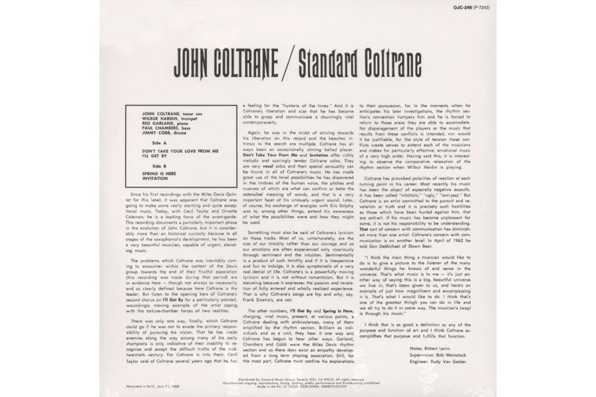 John Coltrane (23 вересня 1926 – 17 липня 1967) був американським джазовим саксофоністом, лідером гурту та композитором, який вважається однією з найвпливовіших і найвідоміших фігур в історії джазу та музики 20-го століття. Народився та виріс у Північній Кароліні, після закінчення школи переїхав до Філадельфії для вивчення музики. Ранні роботи Колтрейна в стилях бібоп і хард-боп допомогли йому стати піонером використання модальних підходів і вільного джазу. Протягом кар’єри він очолював численні записи, співпрацював з такими музикантами, як Майлз Девіс та Телоніус Монк, а його музика поступово набувала духовного виміру, що яскраво проявилось у легендарному альбомі A Love Supreme (1965). Колтрейн залишив величезний вплив на музику і після смерті отримав численні посмертні нагороди, включно зі спеціальною Пулітцерівською премією.